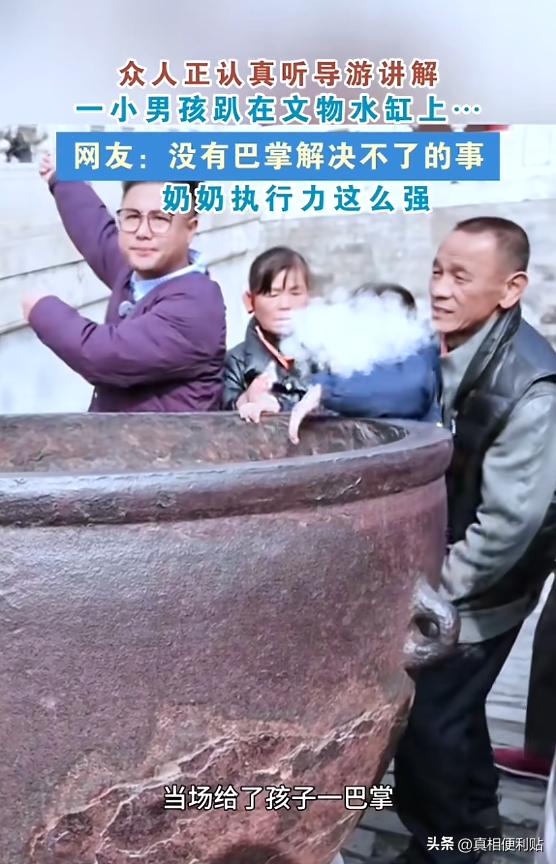 “干得漂亮!”3月5日,北京,一导游正在故宫讲解,一名小男孩突然凑上前,开始攀爬古缸,导游发现后温柔劝阻,旁边的爷爷也过去抱住小男孩,哄他下来,可小男孩就是不撒手,他的奶奶见状,直接给男孩一巴掌,男孩也彻底老实!网友:看爽了! 3月5日的故宫,一声巴掌在红墙院落里格外清脆。那日,北京仍残存着早春的丝丝寒意。一个游客团正簇拥在一口清代铜缸旁,专注聆听着讲解,周遭的清冷似乎也难掩他们探寻历史的热情。导游脖子上挂着扩音器,指着这件存世几百年的文物说着它的来历,周围人举着手机拍照,气氛安静而专注。 蓦地,一个五六岁的男孩自人群中蹿出,他脚踩垫石,手脚协同发力,敏捷地朝着缸沿攀爬而去。半个身子挂在那口暗沉厚重的铜缸边上,抱着缸身不撒手。 年轻的陪导愣了一下,赶紧走过去,放慢语气劝孩子下来,这是珍贵文物,不能攀爬。她说得很客气,但孩子根本没当回事。 爷爷从人群里走出来,轻声细语地哄,伸手去拉的时候动作还有点犹豫。孩子听了几句,反而抱得更紧了。 围观的人越来越多,工作人员不敢强行去拽,老人劝了也没用,几个人就这么僵在那儿。空气绷得越来越紧。 这时候奶奶快步冲了上来,二话不说把孩子从缸沿拉下来,抬手就是一巴掌。刚才还闹腾的小孩瞬间老实了,站在地上不敢动。原本剑拔弩张的气氛瞬间缓和下来,周遭有人忍俊不禁,扑哧一声笑出了声。而那讲解,亦有条不紊地继续推进着。 视频传到网上后,评论区炸开了锅:"干得漂亮""看爽了"的声音此起彼伏。很多人觉得这种时候就该直接一点,温柔劝阻根本没用。 然而,若将视线自那一巴掌处移开,真正值得瞩目的,实则是那口铜缸自身。它静静伫立,承载着岁月的痕迹,等待着人们去探寻其背后的故事。 它不是普通摆设,而是清代留存至今的古建筑配套陈设,现场有明确的"禁止攀爬、禁止触碰"标识。对一个五岁孩子来说,这些信息量为零,他眼里的铜缸可能只是个"好玩的大罐子"。 问题的根源不在于孩子不懂事,而在于没人提前告诉他:这里的每一件东西都承载着时间的重量,保持距离本身就是一种尊重。 如果在进故宫前,家长就用孩子能理解的方式解释这些东西已经存在了几百年,现在能看到很不容易,所以要保持距离即便孩子无法完全理解历史价值,至少能建立起基本的规则意识。奶奶的那一巴掌确实立竿见影,但孩子记住的可能只是"在故宫爬东西会挨打",而不是"为什么不能碰文物"。 事后的惩罚能制止行为,但事前的教育才能塑造认知。那声巴掌响过之后,真正值得思考的,是下一次进博物馆之前,我们该跟孩子说些什么。