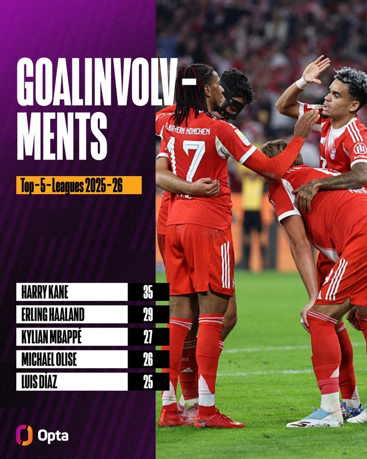 本赛季欧洲五大联赛共有5名球员的进球参与数超过25个。其中3名是拜仁慕尼黑球员。[OptaFranz]