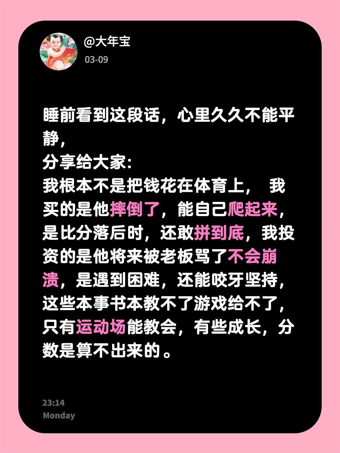 睡前看到这段话,心里久久不能平静, 分享给大家: 我根本不是把钱花在体育上, 我买的是他摔倒了,能自己爬起来,是比分落后时,还敢拼到底,我投资的是他将来被老板骂了不会崩溃,是遇到困难,还能咬牙坚持,这些本事书本教不了游戏给不了,只有运动场能教会,有些成长,分数是算不出来的。