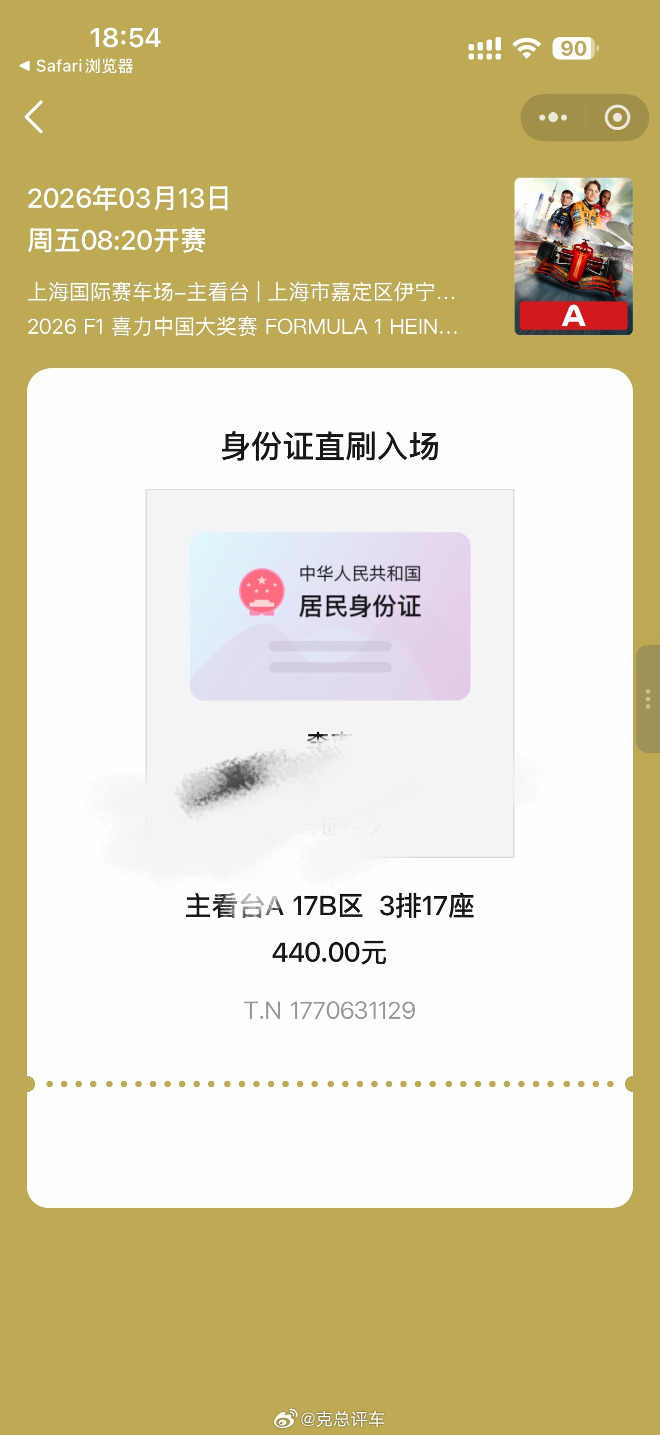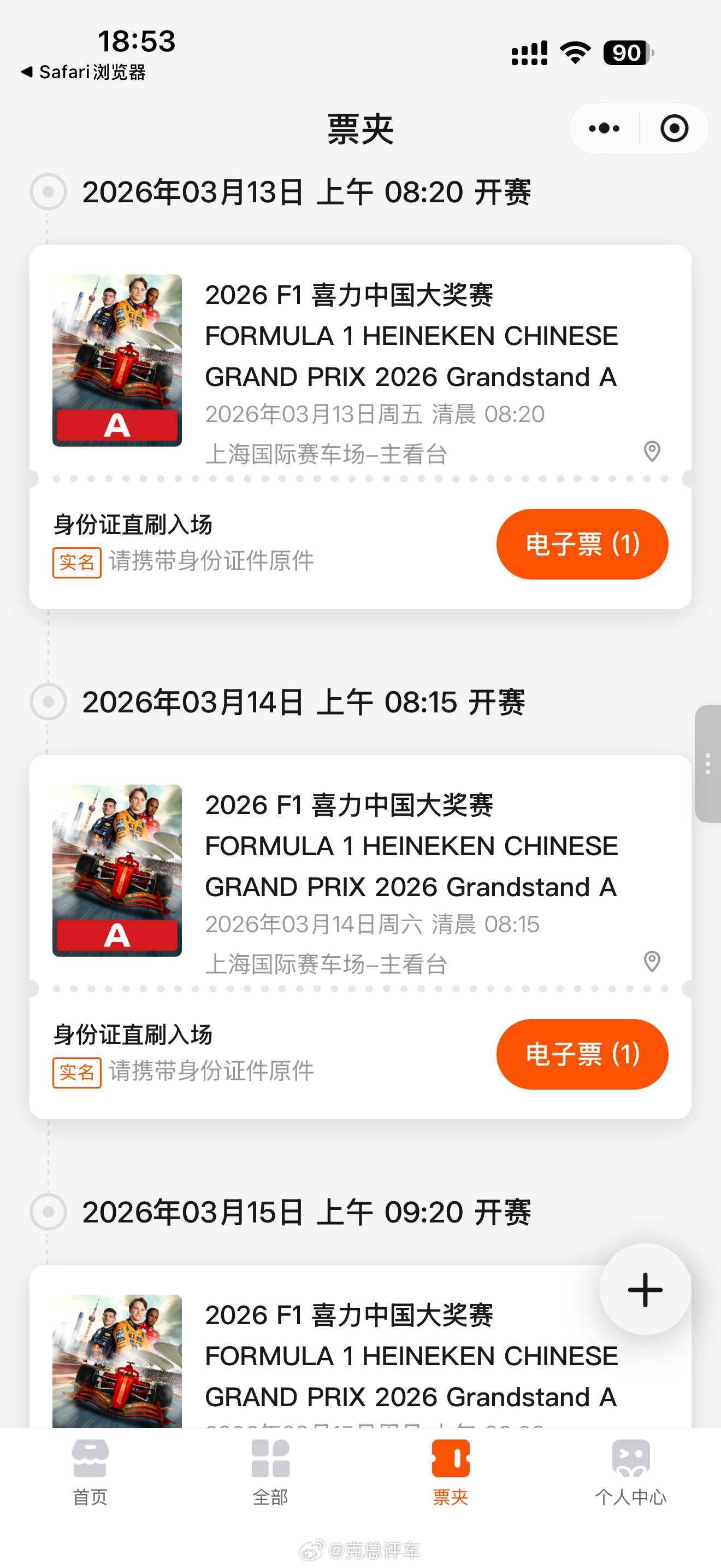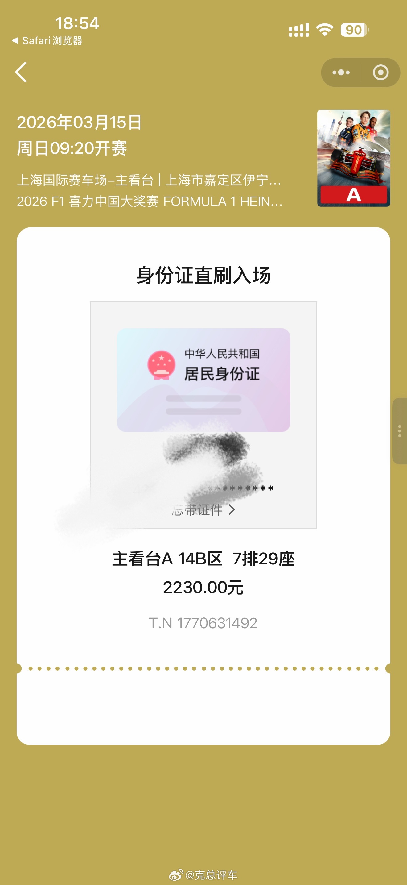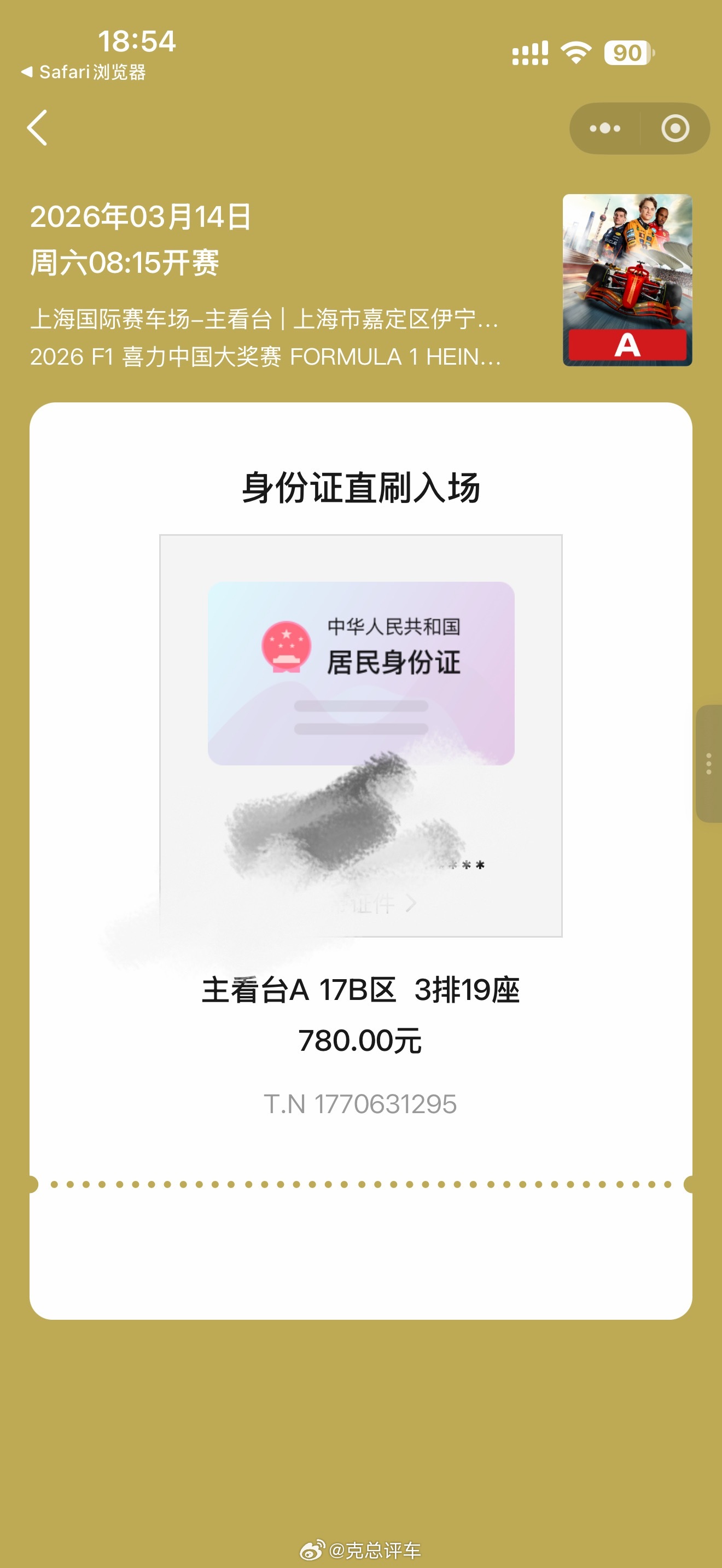 【久事体育】您的 2026 F1 喜力中国大奖赛 FORMULA 1 HEINEKEN CHINESE GRAND PRIX 2026 Grandstand A 已出票,座位信息:主看台A 14B区 7排 29座,赛事时间为:2026-03-15 09:20:00,地址:上海市嘉定区伊宁路2000号。…查看您的电子票。请务必截图保留电子票二维码、务必携带本人身份证原件。