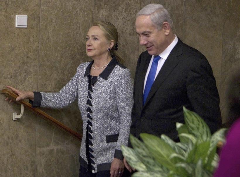 希拉里和内塔尼亚胡互动像姐弟俩。 弟弟做对了,姐姐会夸一夸; 姐姐板着脸不理他,弟弟低着头,如同做错事的孩子。