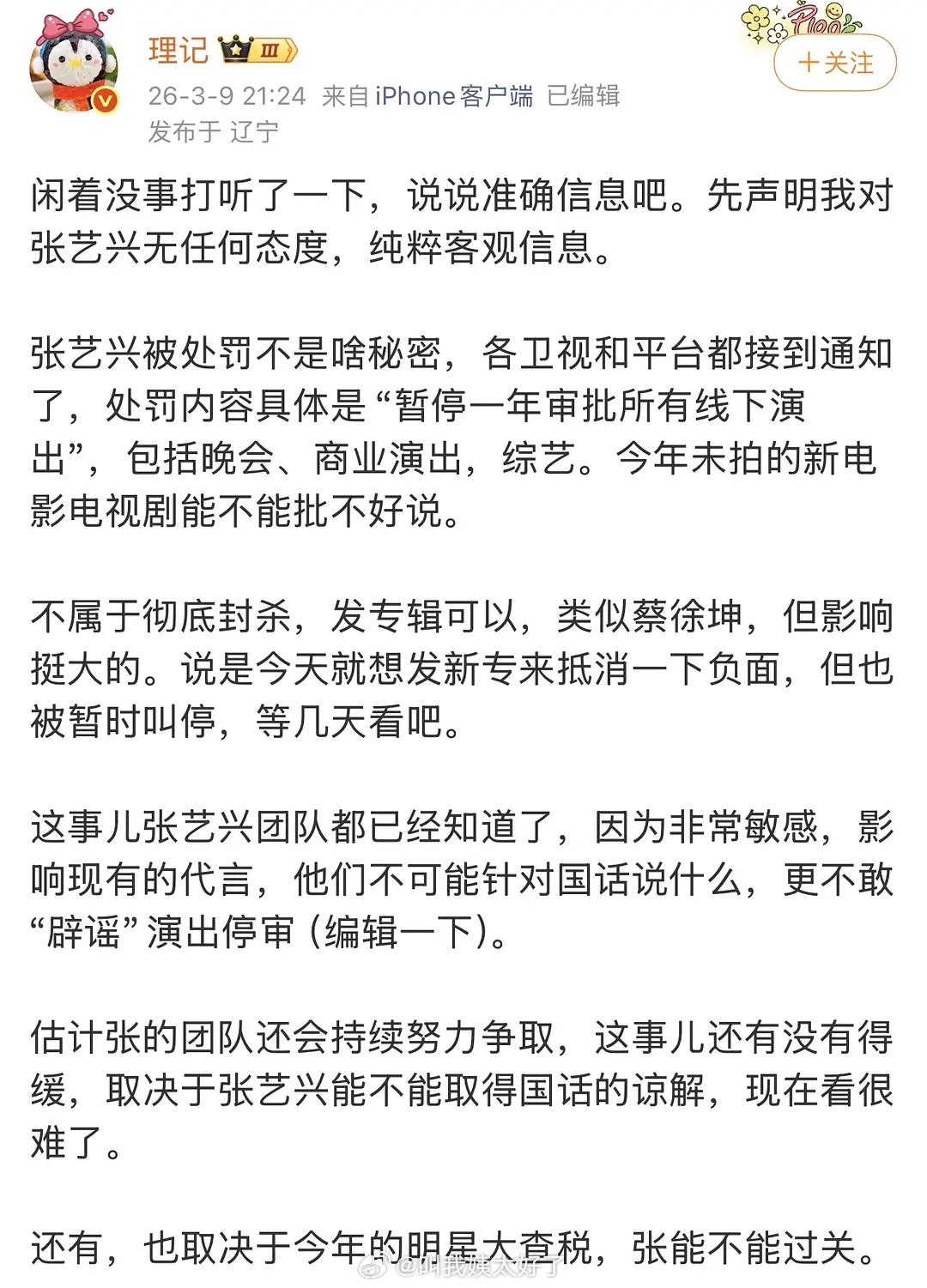 理记对张艺兴这件事情的观点:张艺兴被处罚不是啥秘密。他发完这段话以后张艺兴工作室出了声明,所以你站谁?