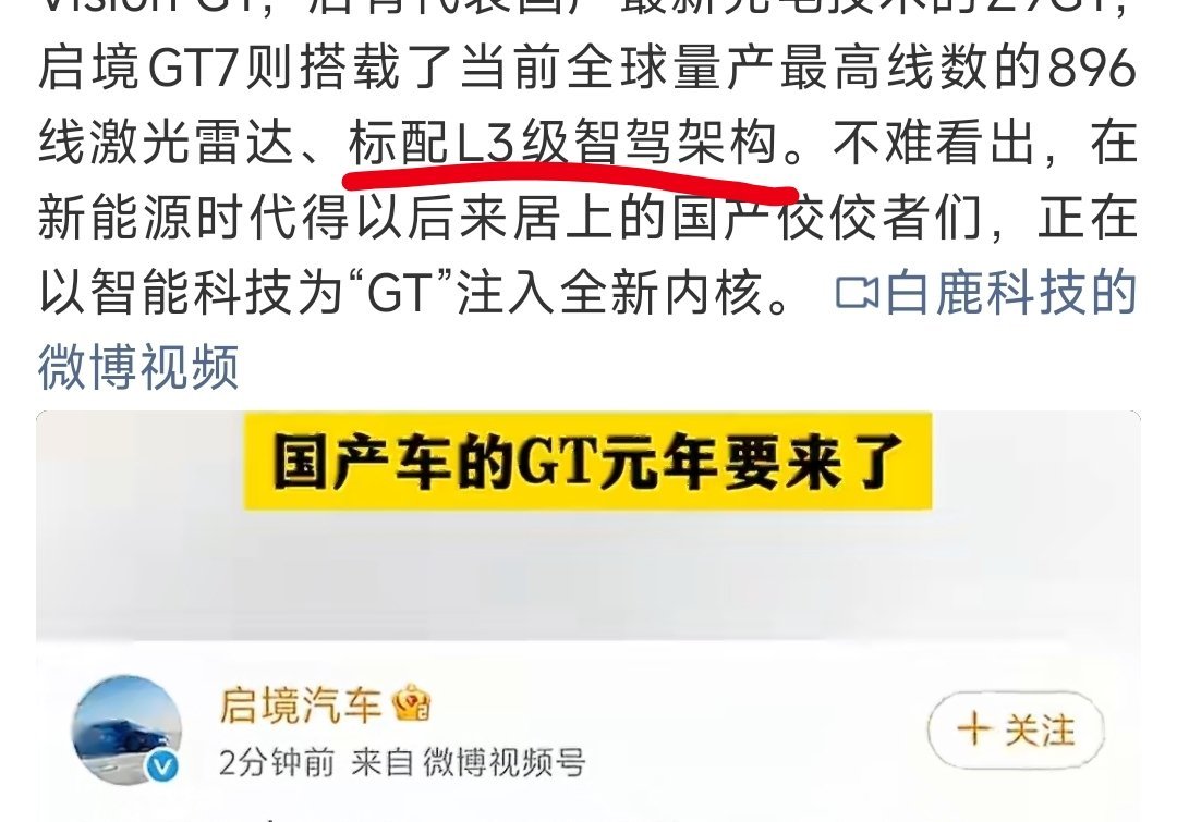 标配L3智驾结构,所以是不是可以侧面说明,L3的辅助驾驶正在路上了?今年有可能落地?启境首款车型命名GT7国产车的GT元年要来了