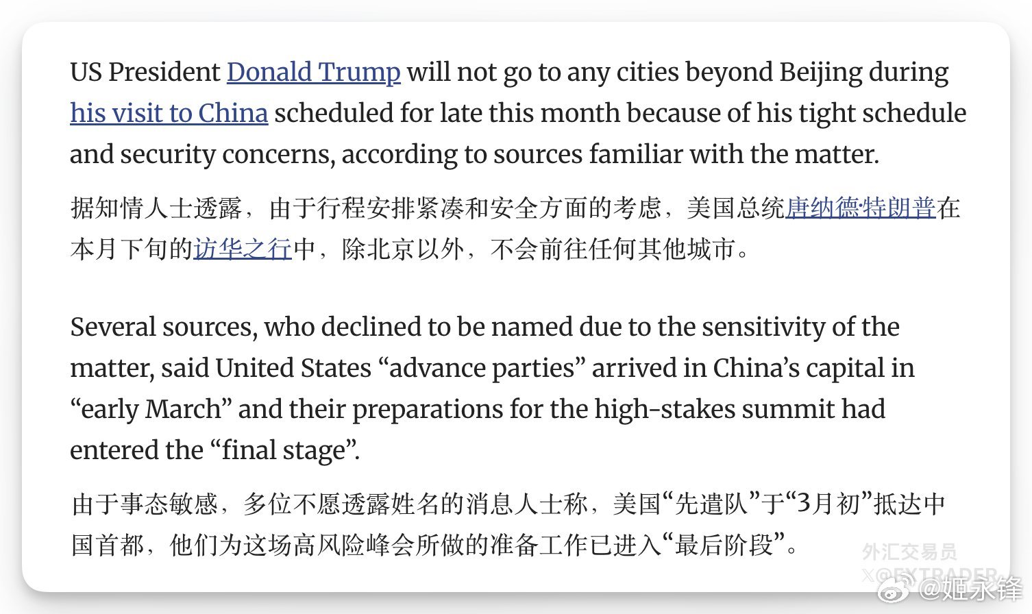 南华早报:由于行程紧凑和安全需要,特朗普的访华之行仅限于北京。