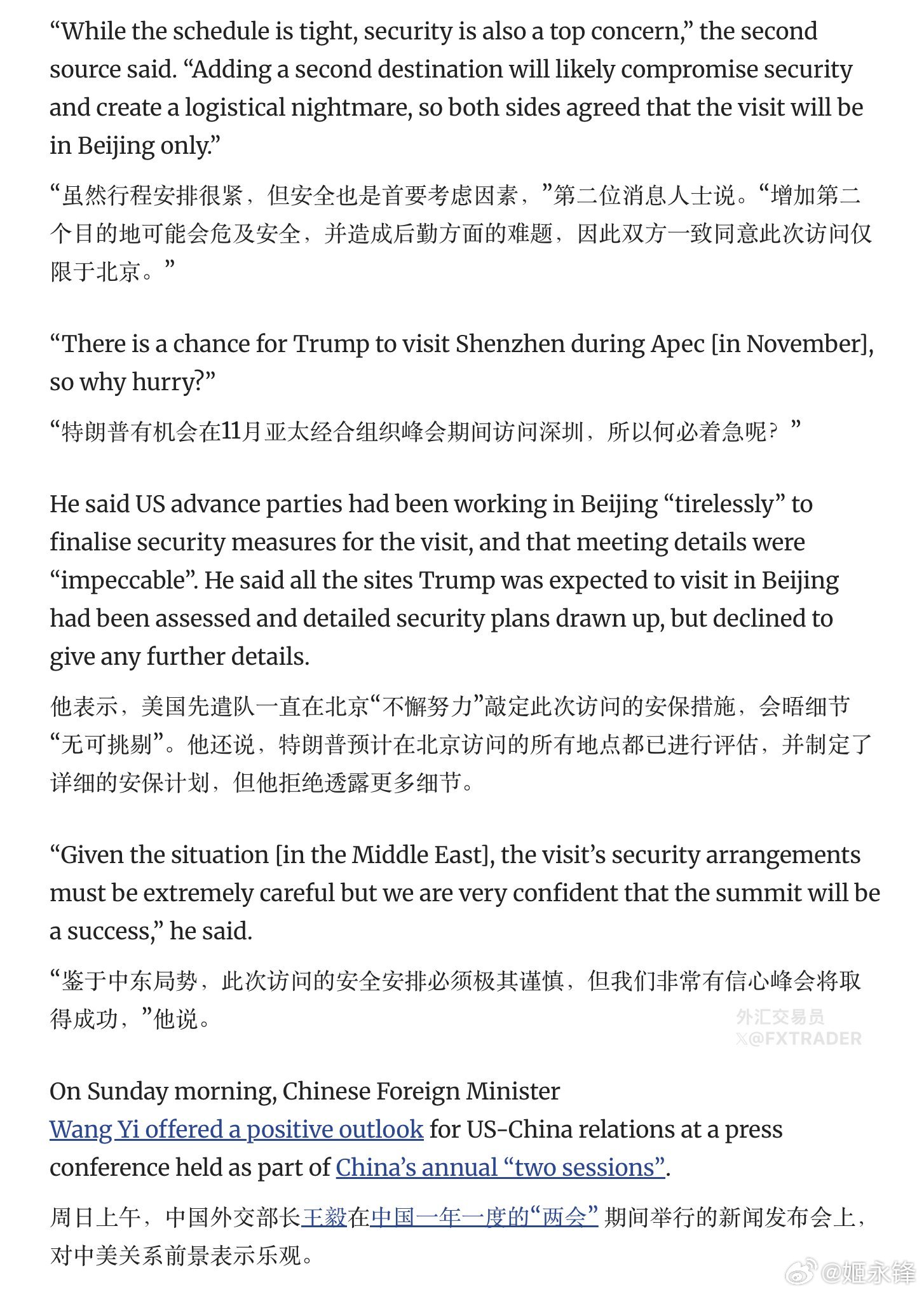 美国“先遣队”已于3月初抵京,准备工作已进入“最后阶段”。“增加第二个目的地可能会危及安全,并造成后勤方面的难题,因此双方一致同意此次访问仅限于北京。”