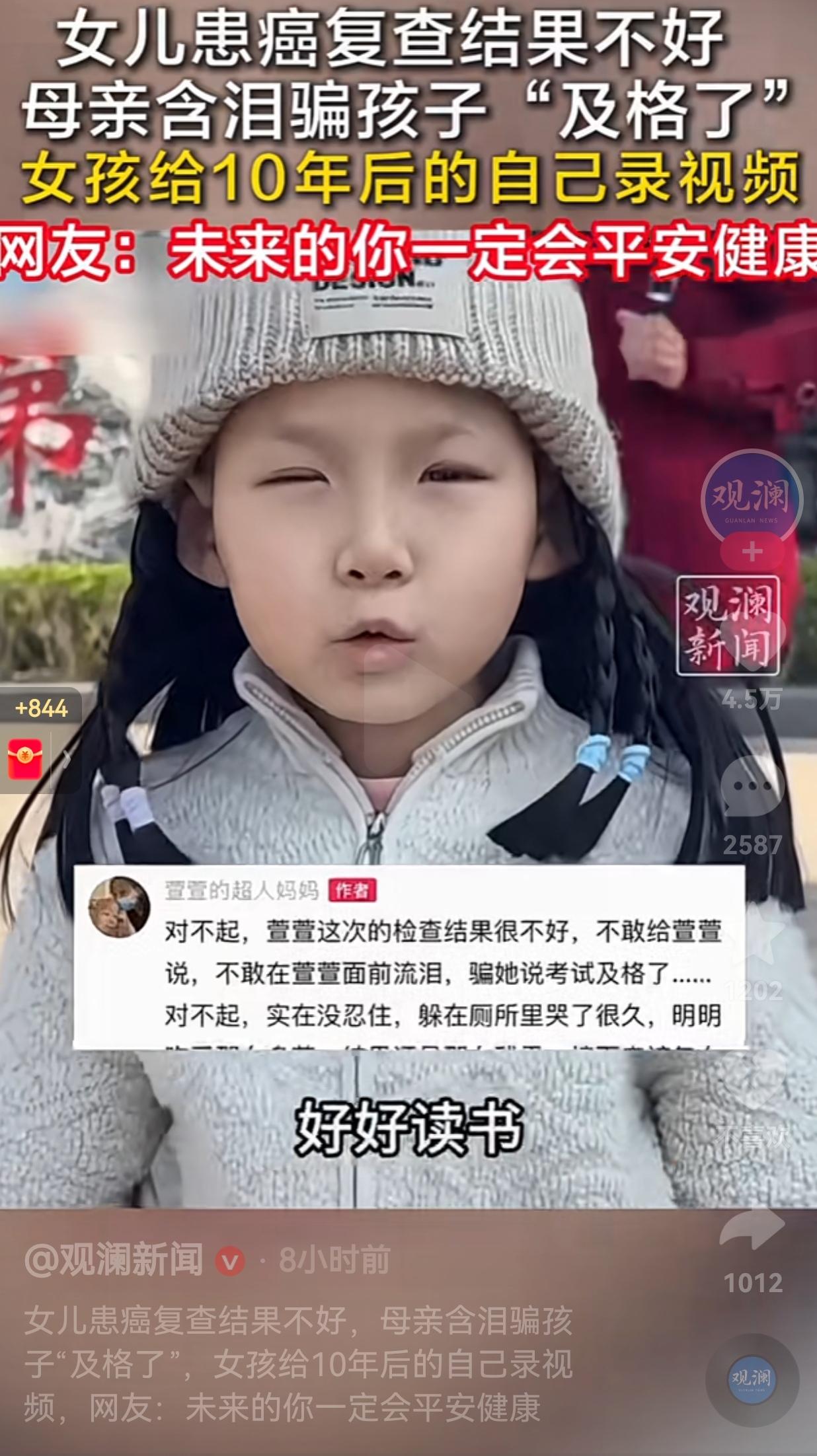 看哭了!命运真的捉弄人,这么小怎么患这种疾病呢?重庆一个小丫头,叫萱萱,才几岁大,扎着小辫子,戴着个小帽子,笑起来特别甜特别乖,看着就让人喜欢。 她站在路边,特别认真地对着手机镜头,奶声奶气地说:“今天是2026年3月5号,我在重庆,我想对10年后的自己说几句话…… 孩子太懂事了,懂事得让人心疼。她一直以为,去医院就是去“考试”,复查结果就是“分数”。她还开开心心地跟镜头说:“我的考试成绩出来啦,妈妈说我考及格了!” 可谁能知道,镜头外的妈妈,早就心疼得快碎了。检查结果一点都不好,妈妈不敢说,不敢在孩子面前哭,只能偷偷躲在厕所里,捂着嘴崩溃大哭。 妈妈自己发视频说:对不起宝贝,这次检查没考好,妈妈骗你了,实在撑不住,躲起来哭了好久…… 我看着萱萱小小的身子,对着未来许愿:要健健康康的,要爱妈妈,要好好学习,要去帮助别人,想做什么就大胆去做……每一句都软软的,可每一句都扎在我心上。 她才这么小啊,还没吃够好吃的,还没玩够喜欢的玩具,还没好好长大,就要承受这么大的病痛。而妈妈呢,明明心里比谁都痛,却还要强装笑脸,给孩子编一个最温柔的谎言,撑起一片不让她害怕的天。 网友看到后评论说:“看完真的破防了,眼泪止不住。宝贝一定要挺过去,十年后你一定要笑着看这条视频!” 也有的网友说:“眼睛里有光的小朋友,一定会打败病魔,平平安安长大!” 还有的网友说:“小小年纪这么懂事,真的太心疼了,愿所有病痛都离孩子远点。” 我们平时总爱抱怨,上班累、赚钱难、日子不顺心,为一点小事就生气、焦虑、内耗,总觉得生活不够好,总想要更多。 可是,看看萱萱才明白,健康活着,平安陪着家人,就是这辈子最顶格的幸福。 我们每天嫌弃的平凡日常:早上能吃口热饭,晚上能踏实睡觉,能跑能跳,能跟爸妈拌嘴,能跟朋友大笑——这些我们随手可得的东西,却是这个小女孩和她妈妈,拼了命都想留住的奢望。 真的,别再不知足了,别再把坏情绪留给最亲的人了,别总说“等以后”“等有空”了。 我们健健康康站在这里,就已经赢过太多人了。