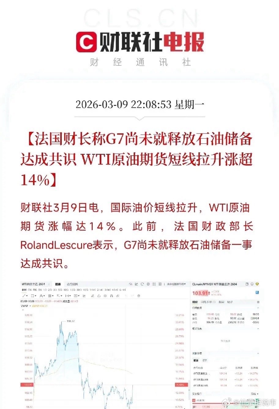 1. “希望落空”有多致命? 就在几小时前,市场还在为“G7拟联合释储”的消息兴奋不已。上午消息,G7财长将召开紧急电话会议,讨论在国际能源署(IEA)框架下协调释放应急石油储备。甚至有消息称,美国提议释放3亿至4亿桶储备,占IEA成员国总储备的25%至30%。原油价格由早盘上涨30%,回落到7%左右。 结果法国财长一句话,戳破幻想:还没达成共识。市场的第一反应就是:赶紧抢油,原油价格瞬间由7%拉升到了14%。2. 为什么G7谈不拢? 各方利益不同,步调自然难齐: · 美国:态度积极,提出释放3-4亿桶的大方案 · 日本:已指示国内石油储备机构,做好释储准备,10处国家基地进入待命状态 · 韩国:相对谨慎,总统政策负责人表示“暂未进入讨论阶段” 三家表态,三种节奏。G7想拧成一股绳,谈何容易。3. 市场在恐慌什么? 伊拉克石油产量已从战前的430万桶/日,跌至170万桶左右,科威特也宣布“预防性削减”生产。霍尔木兹海峡——全球约20%的原油和20%的LNG贸易经过这里,如今航运近乎瘫痪。 如果海峡持续关闭,油价可能试探120美元,甚至冲向150美元,伊朗甚至喊出200美元。在这个节骨眼上,释放存储的“希望”一旦落空,市场的反应必然是有点激烈。
