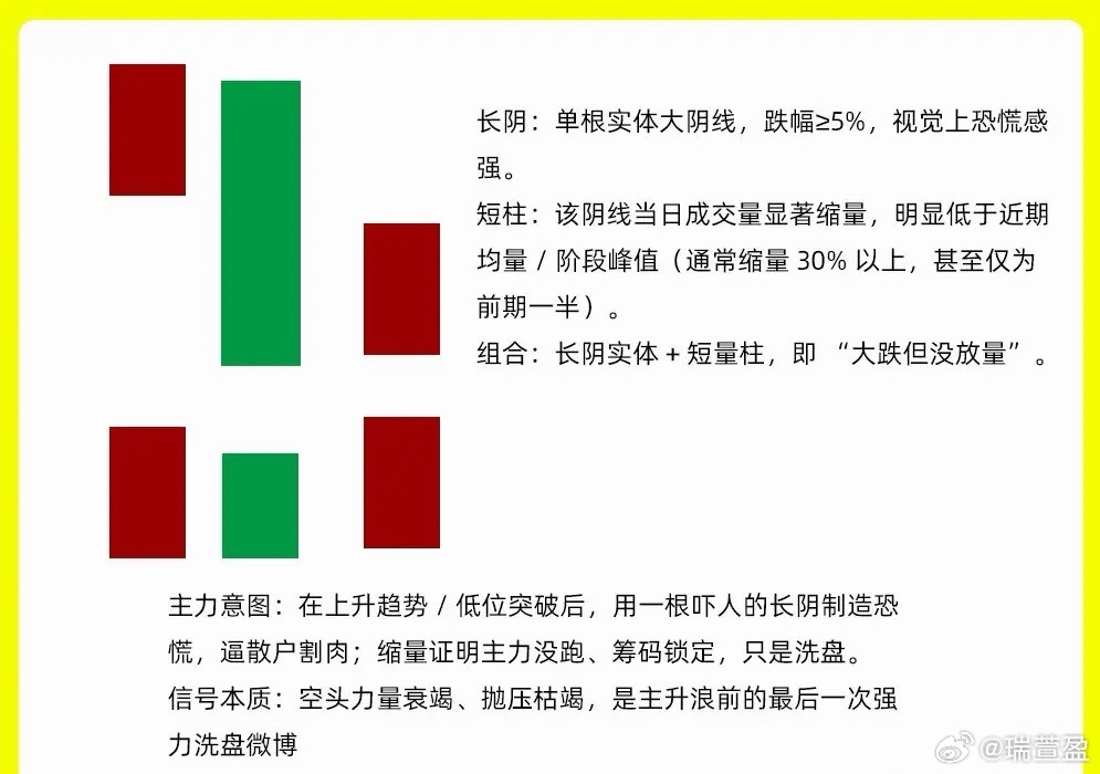 长阴压短柱形态其实很好理解长阴是指的的中大阴线,而短柱是成交量,是一个小阴柱。这种形态一般出现上涨趋势里,或是底部突破以后出现比较多首先,股价出现一个中大阴线,下跌幅度是5%以上,属于大幅下跌同时,下方成交量出现大幅缩量,是平日成交量的一半以内,形成短柱。出现这种反差式的形态,缩量代表主力并没有出货,而是筹码锁定,这里有一个细节,那就是换手率并不很大,这样大幅下跌其实主力洗盘手法一定要注意,这种形态如果是出现高位,股价已经经过了长时间的上涨以后,那就要谨慎了如果是低位出现,那均线一般也会出现多头趋势,说均线开始走平,抬头。这就是长阴压短柱,后市猛如虎一个形态。复盘的时候可以留意这种形态。如果还有什么问题,可以留言告诉我。希望对大家有启发,也是最为基础的内容,一定吃透。