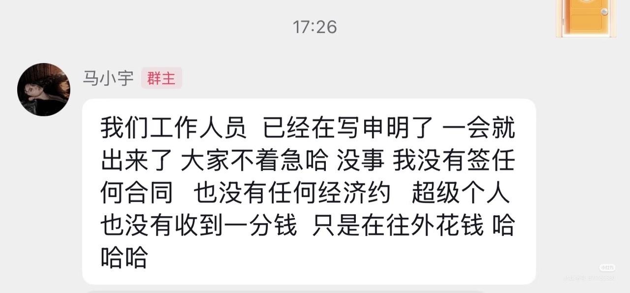 马小宇反应迅速,紧急声明 他没有签约,没有收一分钱,他是个体工作室,那个告他的公司根本没有跟他有任何经济来往。 简单来说就是,一个公司和第三方没有经过马小宇本人签了合同,说要马小宇去东南亚开见面会,然后签约的第三方公司实际上和马小宇本人没有合作,对面就直接说马小宇违约,带马小宇名字炒作,实际上马小宇本人没有签任何合约也没有收到任何钱。 马小宇是清白的,他可以告对面公司侵犯名誉权了