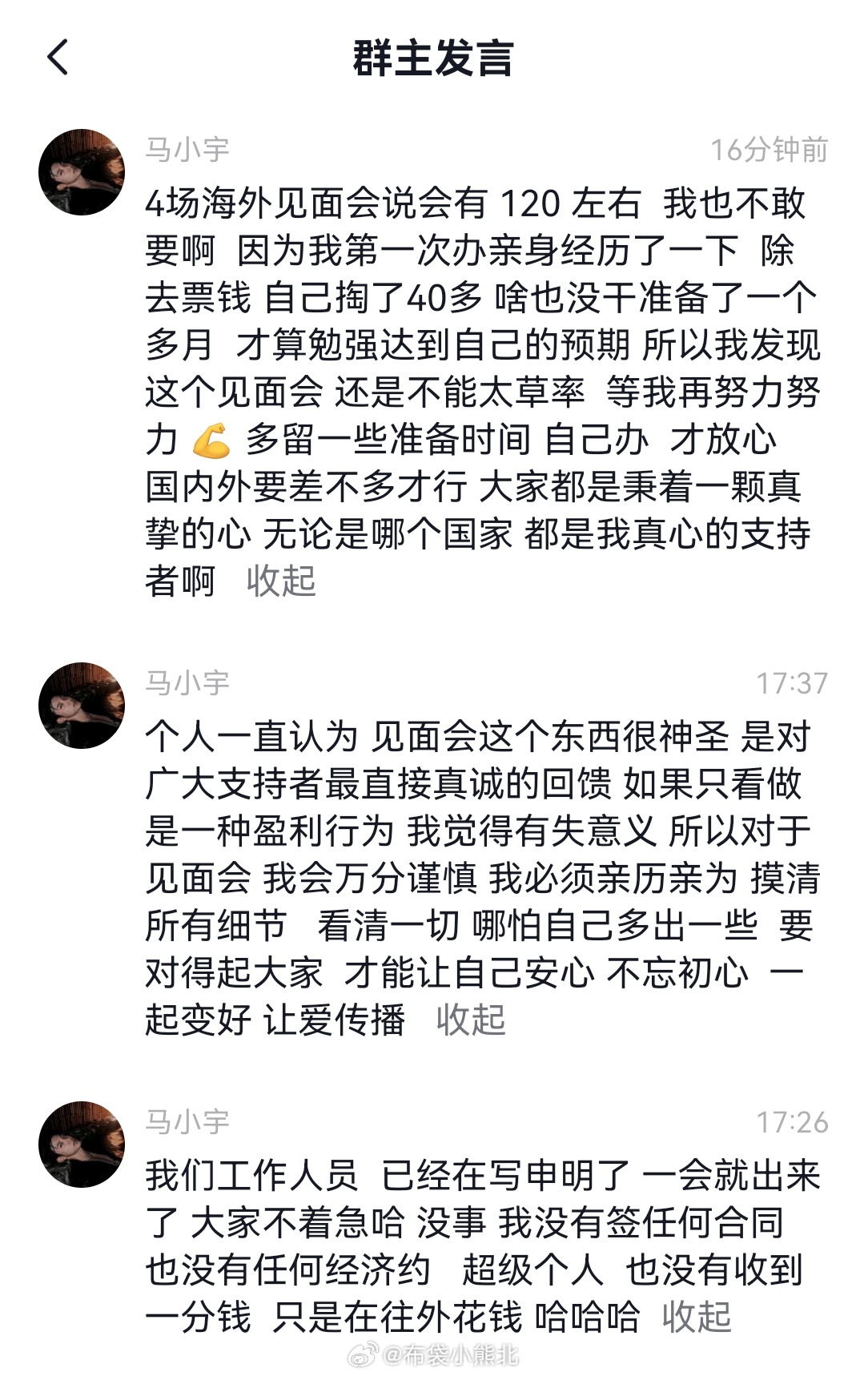很久之前我就说过马小宇是一个很爱惜羽毛很珍惜粉丝的人,对他来说办见面会是一种回馈粉丝的模式而不是赚钱的工具。马小宇第一次生日见面会给到每一个粉丝一张金奖券、一人一张的签名照和伴手礼数量有目共睹,他一直很珍惜每一个能够相遇的机会。希望所有人都能看到这个澄清声明。