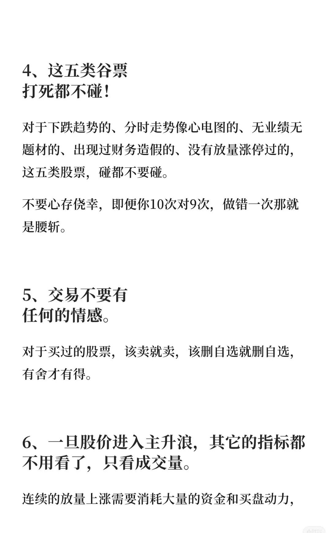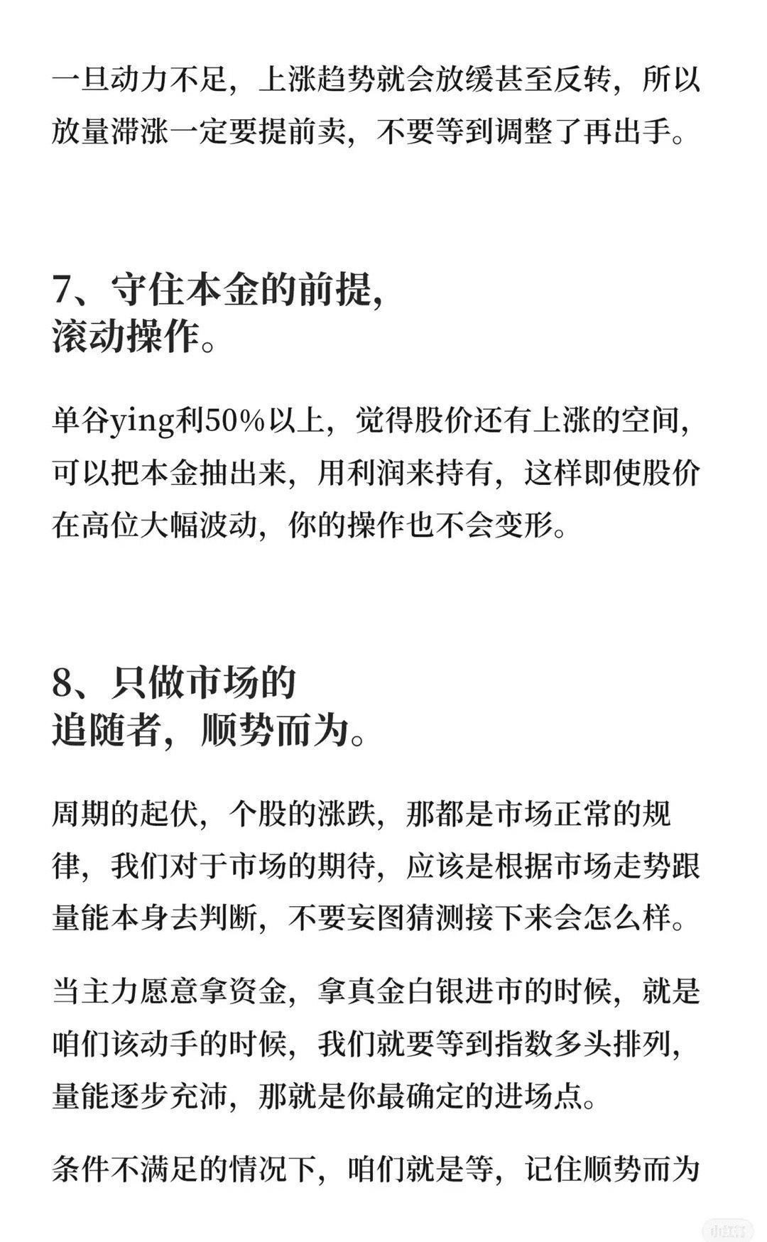 1. 短线策略:不抄底、追高,小资金做大的核心是追龙头(龙头机会大、弱势股风险大,“宁在龙头死,不在杂毛停”)。2. 龙头逻辑:大钱需在主线龙头上“死磕”(专注主线龙头,反复进出,牛市更要抓主线龙头,分散则难成)。3. 趋势本质:炒股是跟随趋势,20日线定趋势(线上向上、线下向下,趋势变则果断操作)。4. 避雷清单:五类股(下跌趋势、分时心电图、无业绩题材、财务造假、无量涨停过)坚决不碰(侥幸易腰斩)。5. 交易心态:交易无情感,卖、删自选要果断(“舍”才有得)。6. 主升浪信号:主升浪只看成交量,放量滞涨提前卖(动力不足则趋势反转)。7. 本金安全:盈利50%+可抽本金,用利润滚动操作(高位波动操作不变形)。8. 顺势而为:做市场追随者,指数多头、量能充沛时进场(条件不满足则等,“顺势”是王道)。