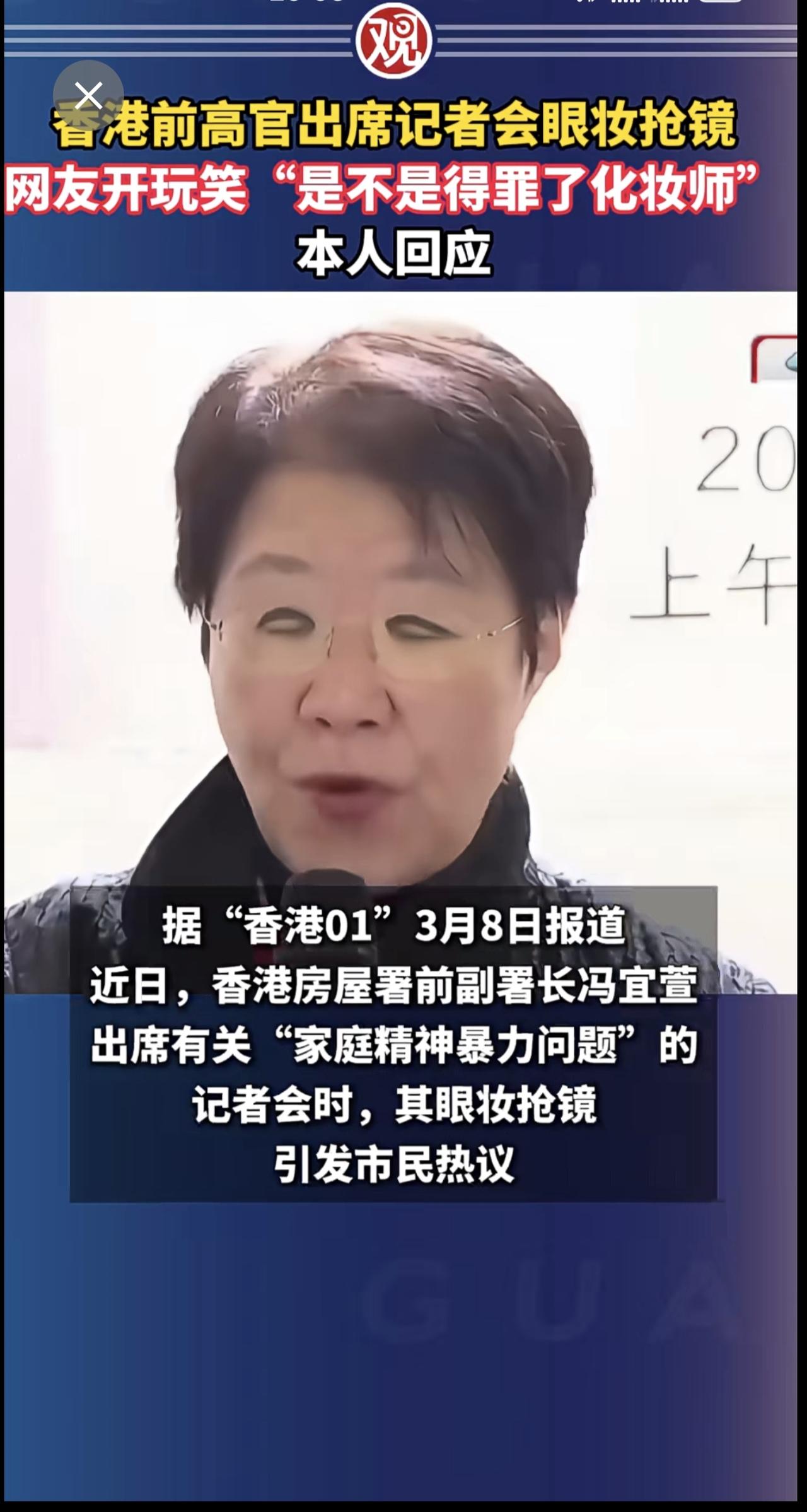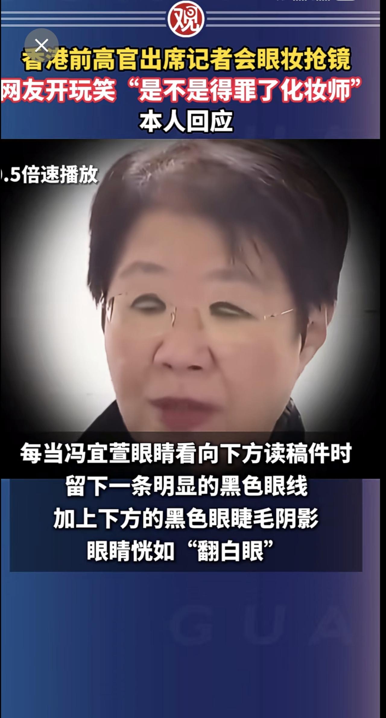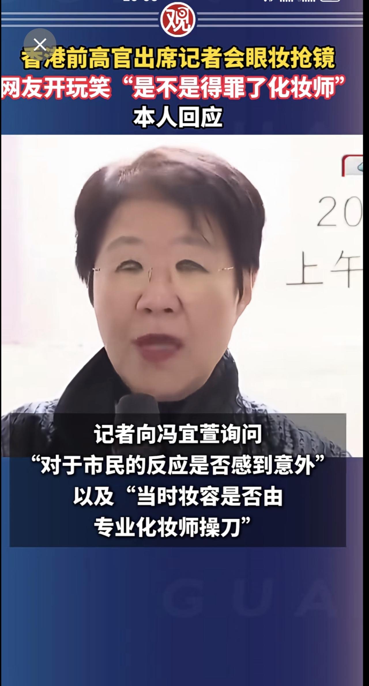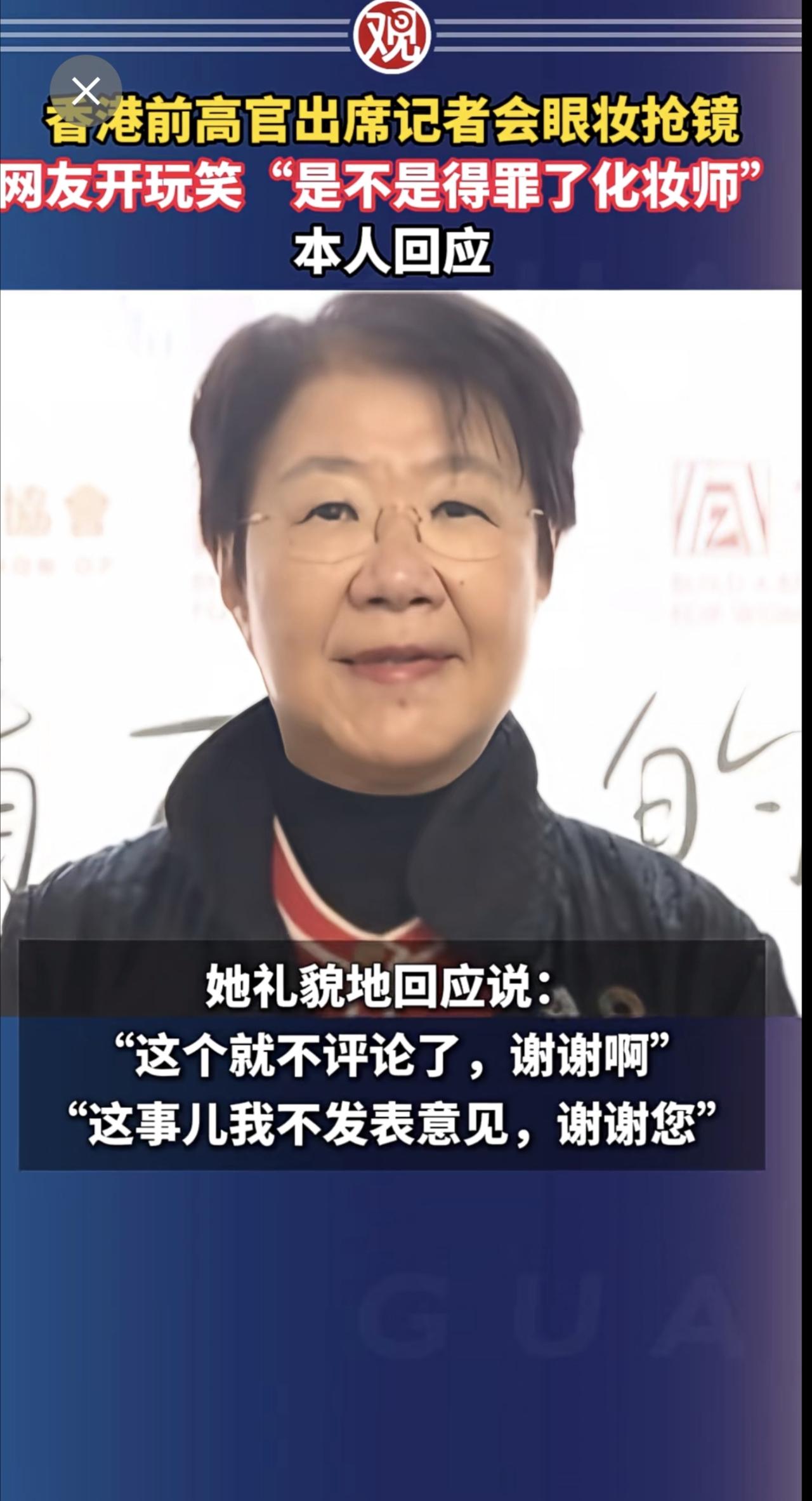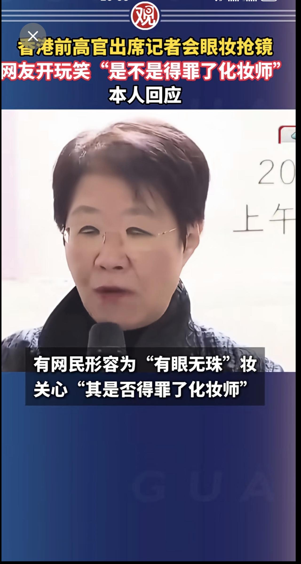 香港前高官出席记者会眼妆抢镜,网友开玩笑“是不是得罪了化妆师”,本人回应。