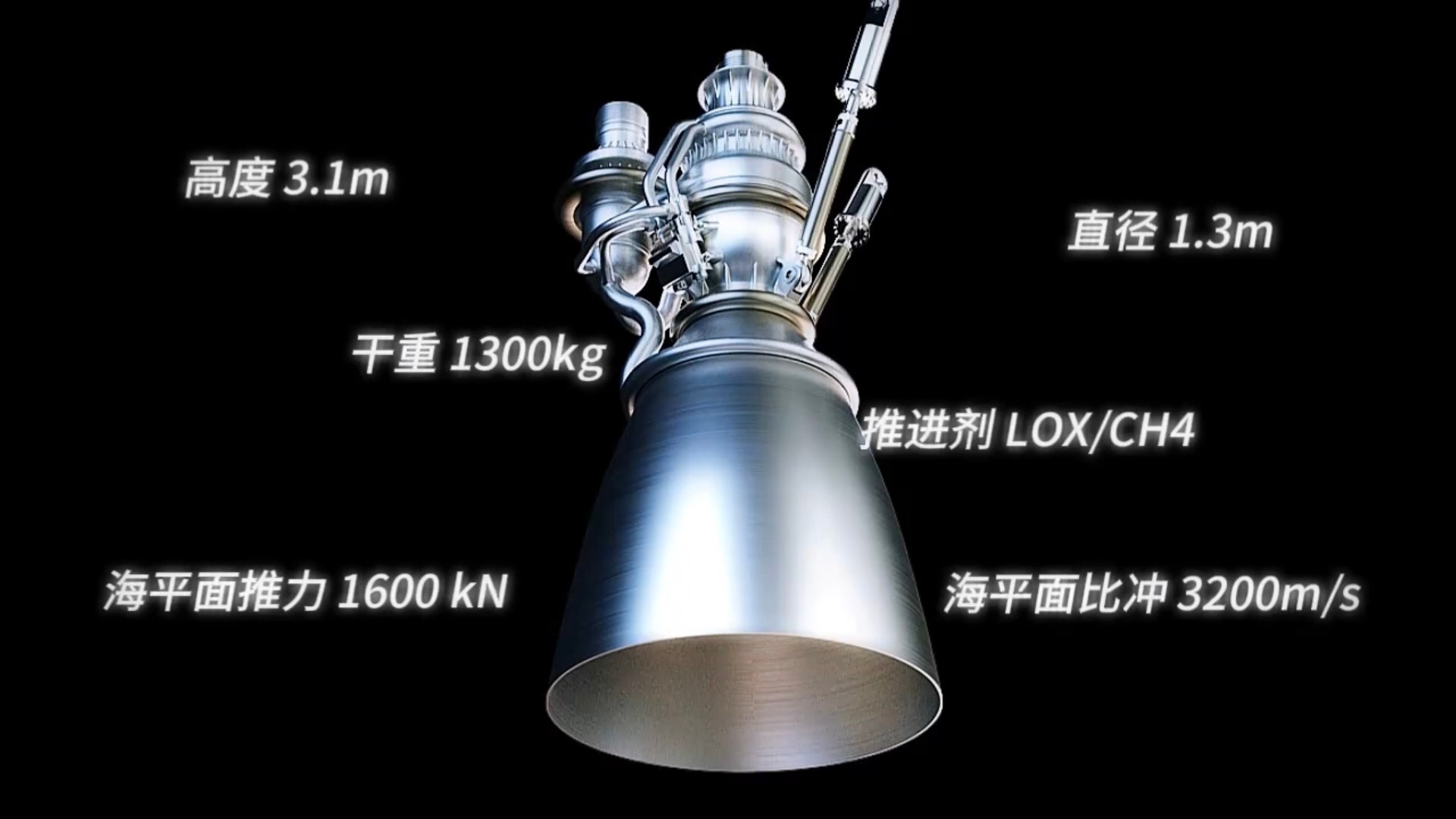 星梭科技猛犸一号全流量补燃循环液氧甲烷发动机高度3.1m,直径1.3m,干重1300kg,海平面推力1600kN,海平面比冲3200m/s