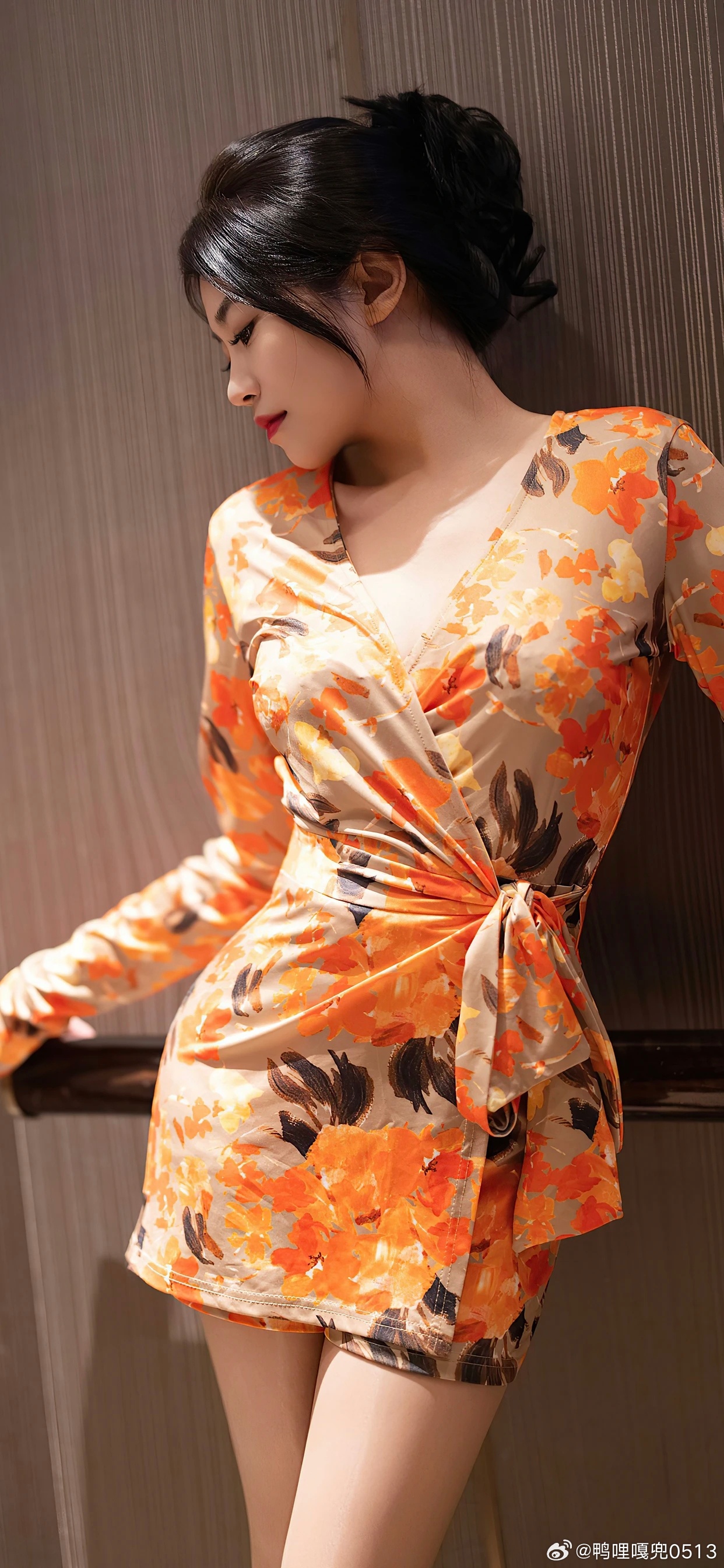 写真 暖色调花卉印花橙色活力满满,V领加侧边系带收腰款式打造沙漏型身材,突出身体曲线层次感凹凸有致,高级感利落优雅气质撩人