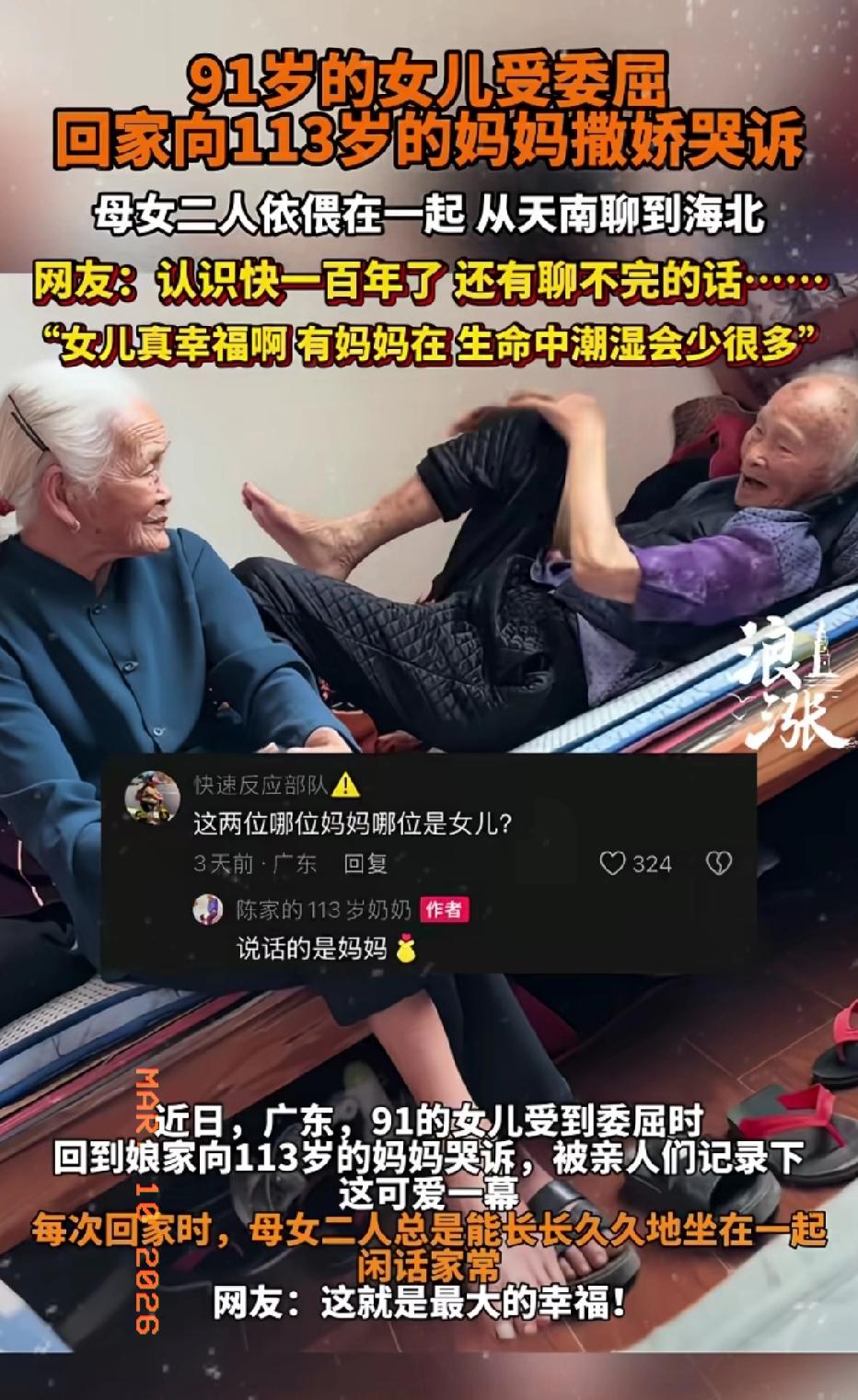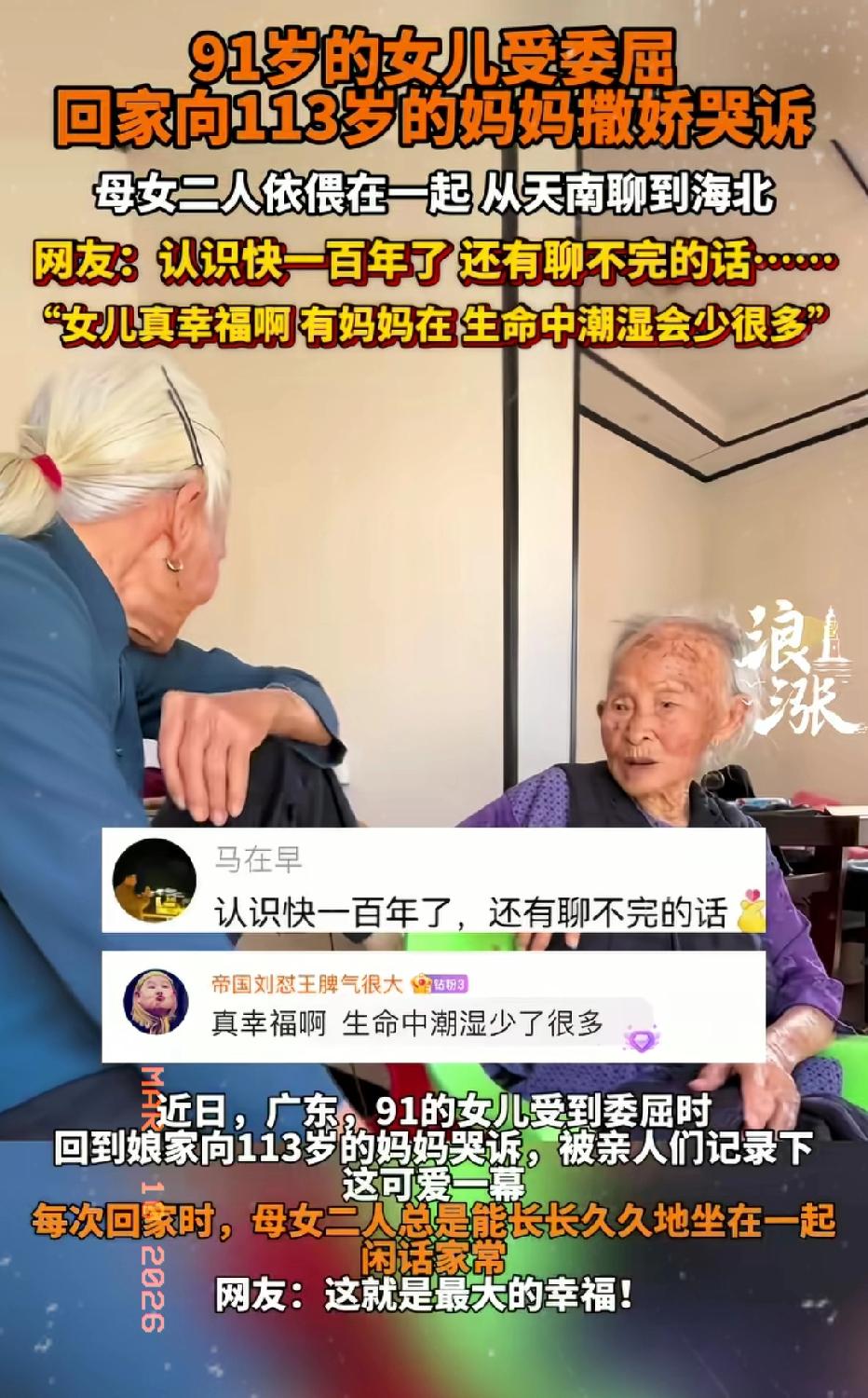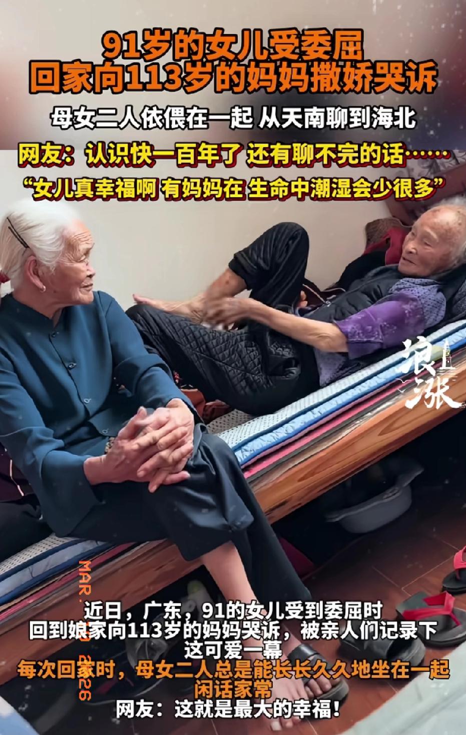 近日广东湛江,91岁的女儿受了委屈,回家找113岁的妈妈哭诉,两人从天南聊到海北,你能看出来哪个是妈妈? 家人记录下这可爱的一幕,:每次回家时,母女二人总是能长长久久地坐在一起,仿佛有说不完的话一样!两人依偎在一起,很幸福看起来,双方认识快一百年了,还有聊不完的话,或许这就是缘分吧!