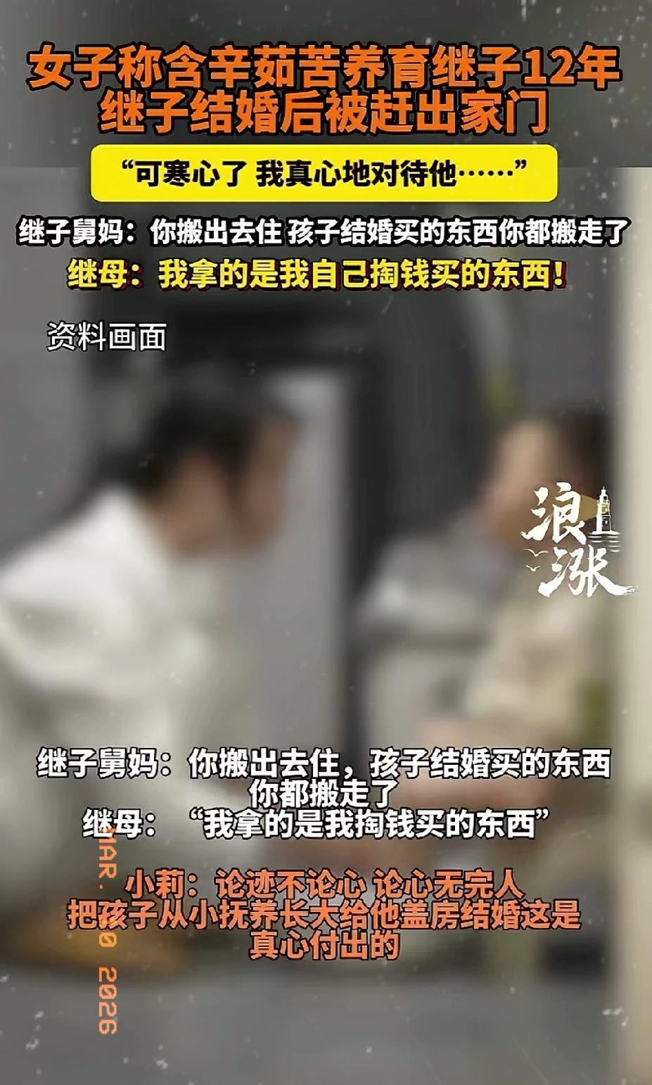 近日河南安阳,一女子含辛茹苦养育继子12年,为其盖房娶妻,没想到继子刚结完婚,就将她赶出了家门! 女子表示:可寒心了,自己这些年真心对他,却在晚年遇到这样的事,继子以女子“性格强势”为由,将她赶出家门!女子回去拿东西,还被继子舅母质疑:你搬出去住,孩子结婚买的东西你都搬走了?女子则表示:这些都是我自己花钱买的东西!你们这样对我,我还不能搬走?