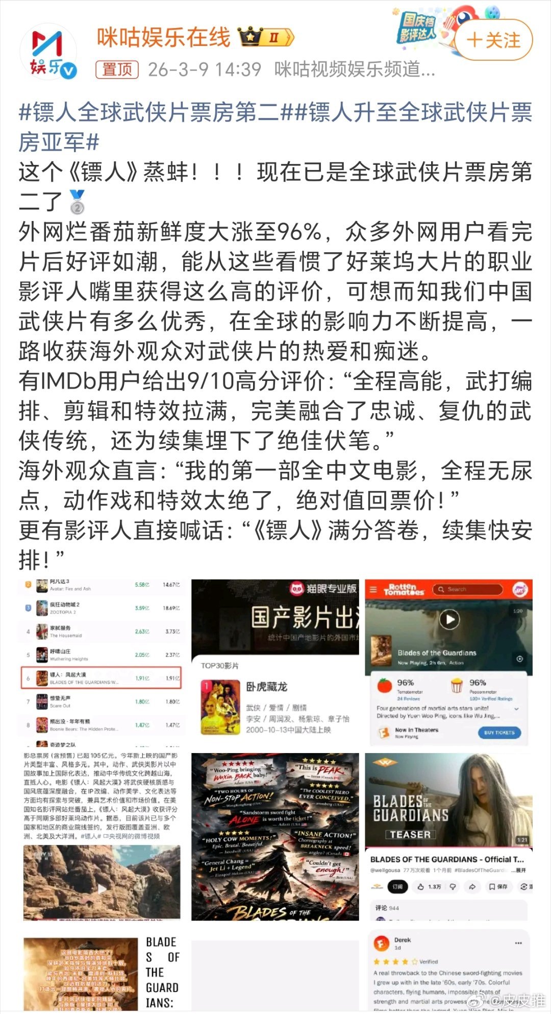 镖人镖人升至全球武侠片票房亚军,网友评论:武打片果然是中国对外的名片之一啊,不能丢了。