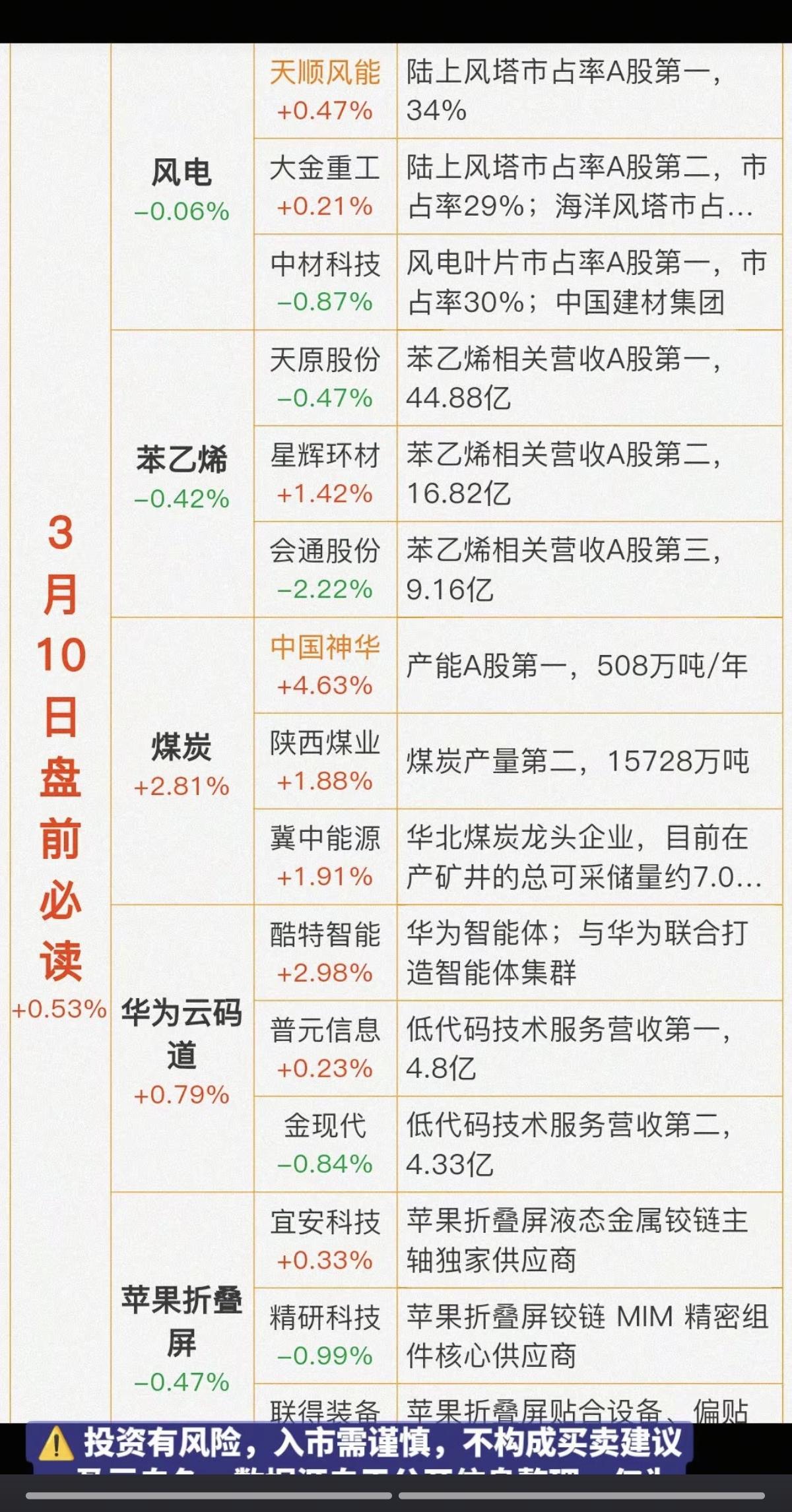 3.10周二 盘前 财经必读! 1.风电设备 2.化工-苯乙烯 3.煤炭涨价 4.华为云码道,智能体 5.苹果折叠屏