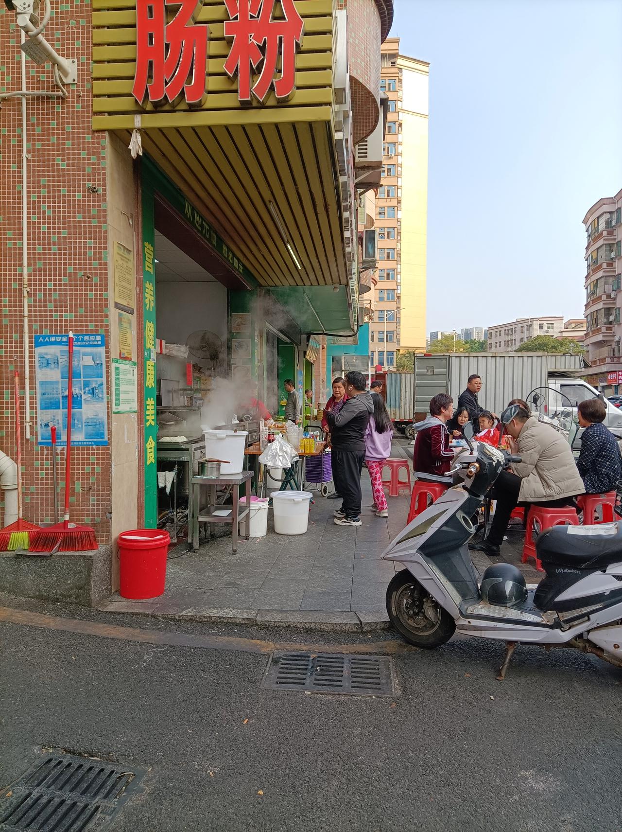 分享今日街头美景早上的街头美景,肠粉店前很热闹,吃肠粉的人很多,但边上的汤包店却少见有人,看起来肠粉还是比较有人喜欢吃的!