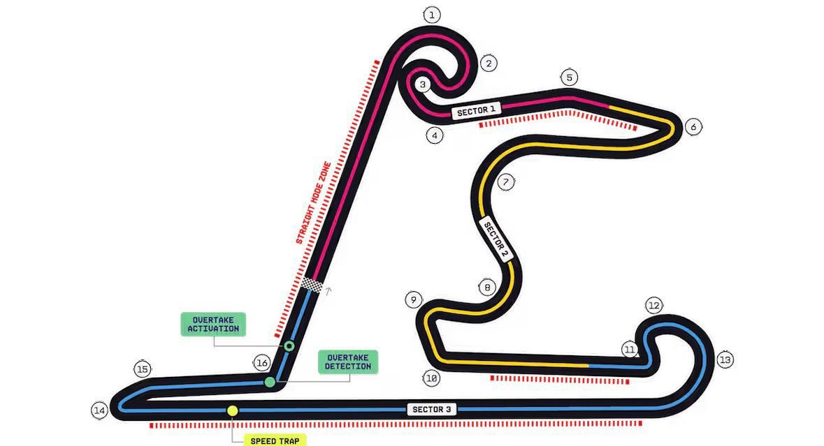 上赛将设有 4 处主动空气动力学“直线模式”激活区域。超车模式的检测区与激活区,将设在赛道最后一个弯。在这条超过 1 公里的超长直道上,超级减阻的效果看起来会非常夸张