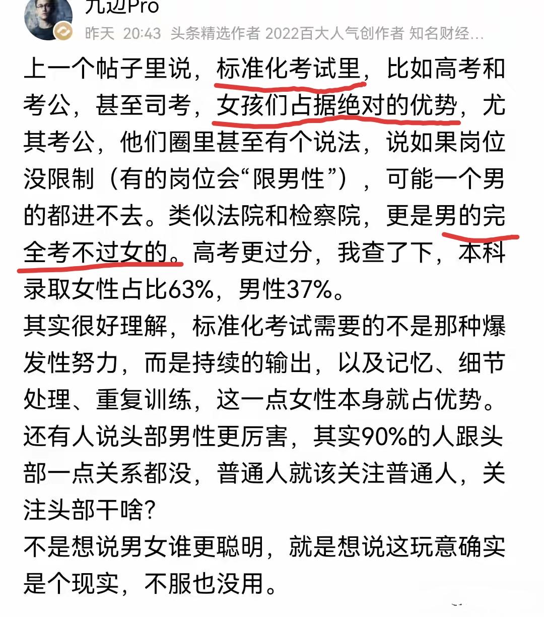 在标准化考试里,比如高考和考公,甚至司考,女孩们占据绝对的优势,尤其考公。这个大V总体上说的没错。 在当前的公务员考试和法律职业资格考试中,女性考生的通过率确实显著高于男性,形成了所谓的“优势”。这就像女生们在这些“赛道”上,普遍跑得更稳、更快。公务员考试那种既要能写、又要细心、还得能说的活儿,很多女生确实准备得更充分,也发挥得更好。 有一点需要说明的是就是他说的太满了:高考这个最大的考试,情况可复杂多了。简单说“女生占绝对优势”有点“地图炮”。理科顶尖的、数理化特别强的,还是男生占多数。高考是“全能赛”,有人靠文科拉分,有人靠理科冲顶,不好一概而论。 “考公女孩厉害”基本是事实,但所有大考女生都绝对碾压就有点夸张了。每个考试不一样,得分开看,不能一棒子全归到性别上。 你们说呢?