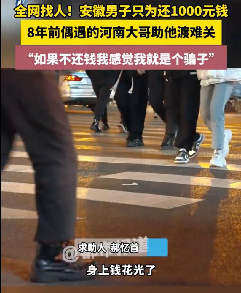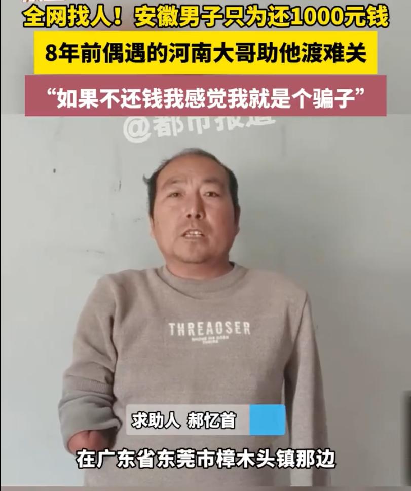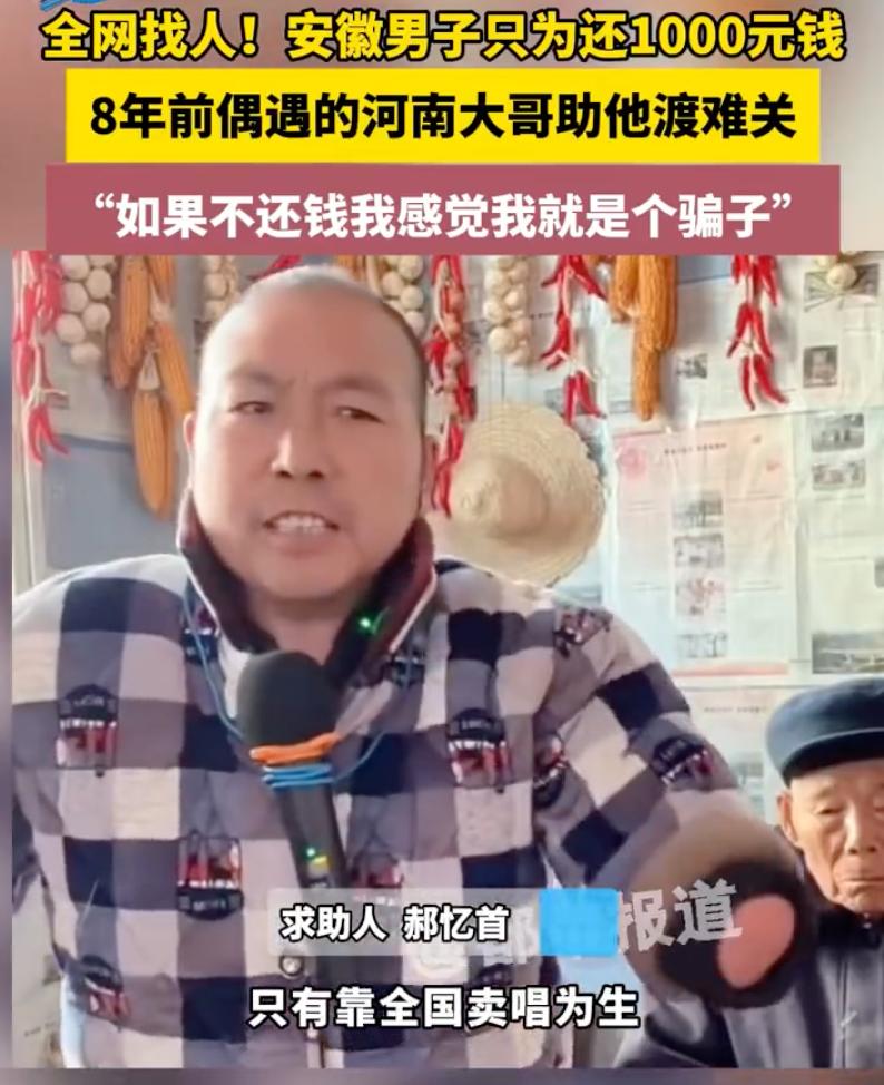 太暖了!安徽,残障歌手郝忆首全网发布寻人视频,只为找到 8 年前借给他 1000 元的陌生恩人。他红着眼说:“做人要讲诚信,这钱不还,我总觉得自己就是个骗子。” 网友:8 年不忘滴水之恩,这才是最难得的双向善意! 故事要从 8 年前说起。当时郝忆首在广东东莞生了重病,身上的钱全花光了,身有残疾的他没法唱歌挣生活费,彻底走到了走投无路的地步。 无奈之下,他在纸板上写下求助牌:谁能借我 1000 块钱解燃眉之急,过后一定会还。 就在他满心绝望的时候,一位陌生男子停下了脚步。他看了求助牌,二话不说掏出 1000 元递到郝忆首手里,只留下一句 “不用还,好好过日子”,就转身离开了。 郝忆首只记得,这位恩人大概 35 岁,是河南新乡人,说话总带着一句 “中中中”。 这一转身,就是 8 年。这些年里,郝忆首从来没忘记过这份恩情,可日子过得实在拮据,两个孩子要上学,90 多岁的老父亲要照顾,经济上一直捉襟见肘,这笔钱迟迟没能还上。他坦言,每次想起这件事心里都不安,总说 “没有这 1000 块钱,就没有我的今天”。 如今,郝忆首终于靠手工劳动攒够了钱,第一时间发布视频全网寻人。他说,转账没有温度,一定要亲手把这 1000 元还给恩人,当面说一声谢谢。 这事传开后,网友们纷纷感慨不已。 有人说,在人人都怕被骗的年代,他能记着这份恩情、执着寻人,人品就已经赢了。 也有人说,恩人当初本就没打算要回报,不如把这份爱心传递下去,帮更多有需要的人。 说实话,这件事最动人的,从来都不是这 1000 块钱。是陌生人不求回报的雪中送炭,在最难的时候给了他活下去的底气;更是郝忆首记了 8 年的诚信与感恩,让这份善意没有被辜负。我们总说人心难测,可最珍贵的,永远是这份不欺心、不忘恩的赤诚。