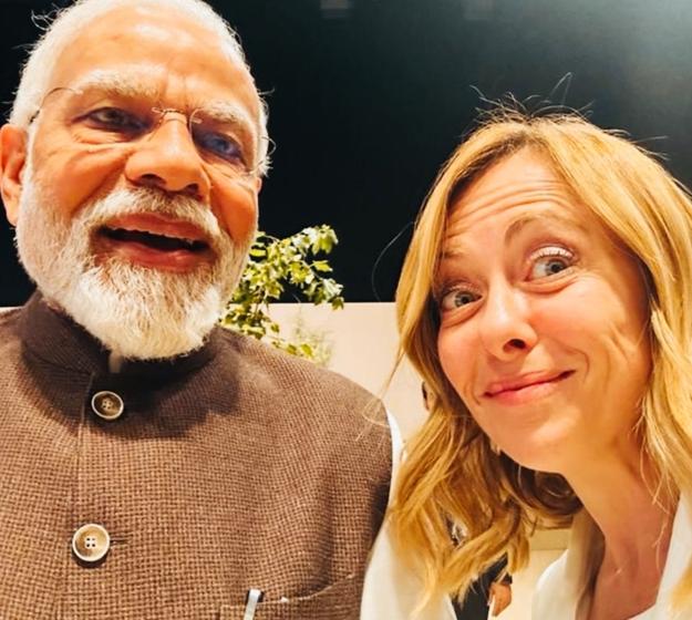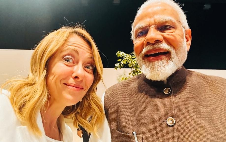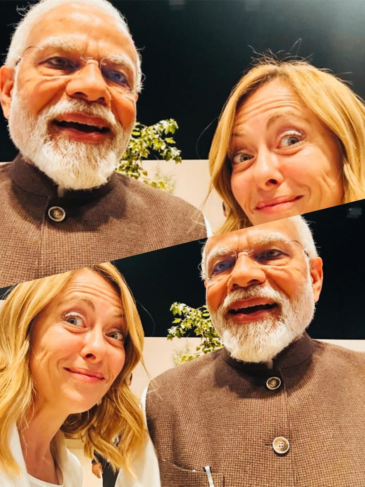 梅洛尼和莫迪合影时,面部表情很有特点啊! 梅洛尼这表情是什么意思呢? 梅洛尼笑的是不是比莫迪笑的还夸张啊? 梅洛尼合个影也太有个性了吧?