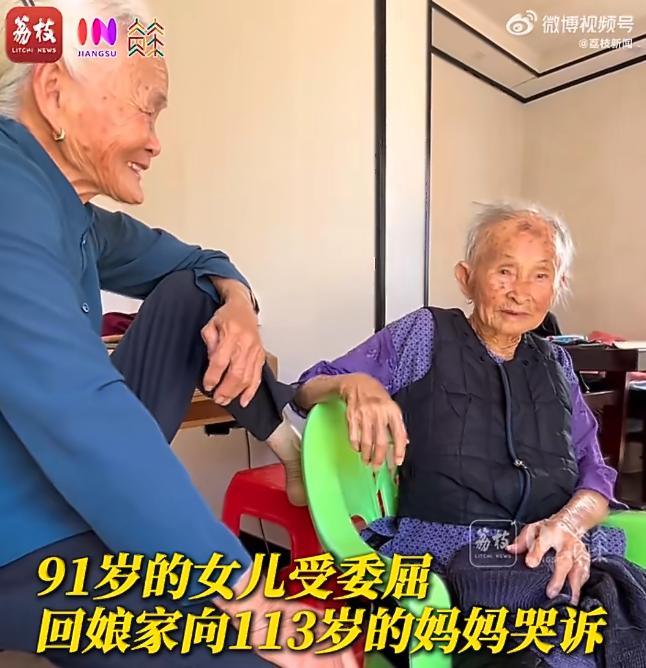 91岁女儿受委屈向113岁妈妈哭诉!全网看哭 近日广东一段视频暖哭全网:91岁女儿受了委屈,第一时间跑回娘家,对着113岁的老母亲哭诉。 在外,她是儿孙满堂的老人,要强了一辈子;可在妈妈面前,瞬间变回那个受了伤就想找依靠的小孩。老人家轻轻安抚,满眼都是心疼,这一幕,让无数人破防。 很多人说:都这么大年纪了,还撒娇,太可爱了。 可只有当过儿女的才懂:不管活到多少岁,在妈妈眼里,永远是孩子。 91岁,还有妈妈可以撒娇、可以倾诉、可以依靠,这是多少人求都求不来的福气。年纪越大越明白,妈妈在,家就在;妈妈疼,心就安。 世上最幸福的事,莫过于:我已白发苍苍,你还在我身旁。 愿天下父母安康长寿,愿我们都有机会,多喊一声妈。