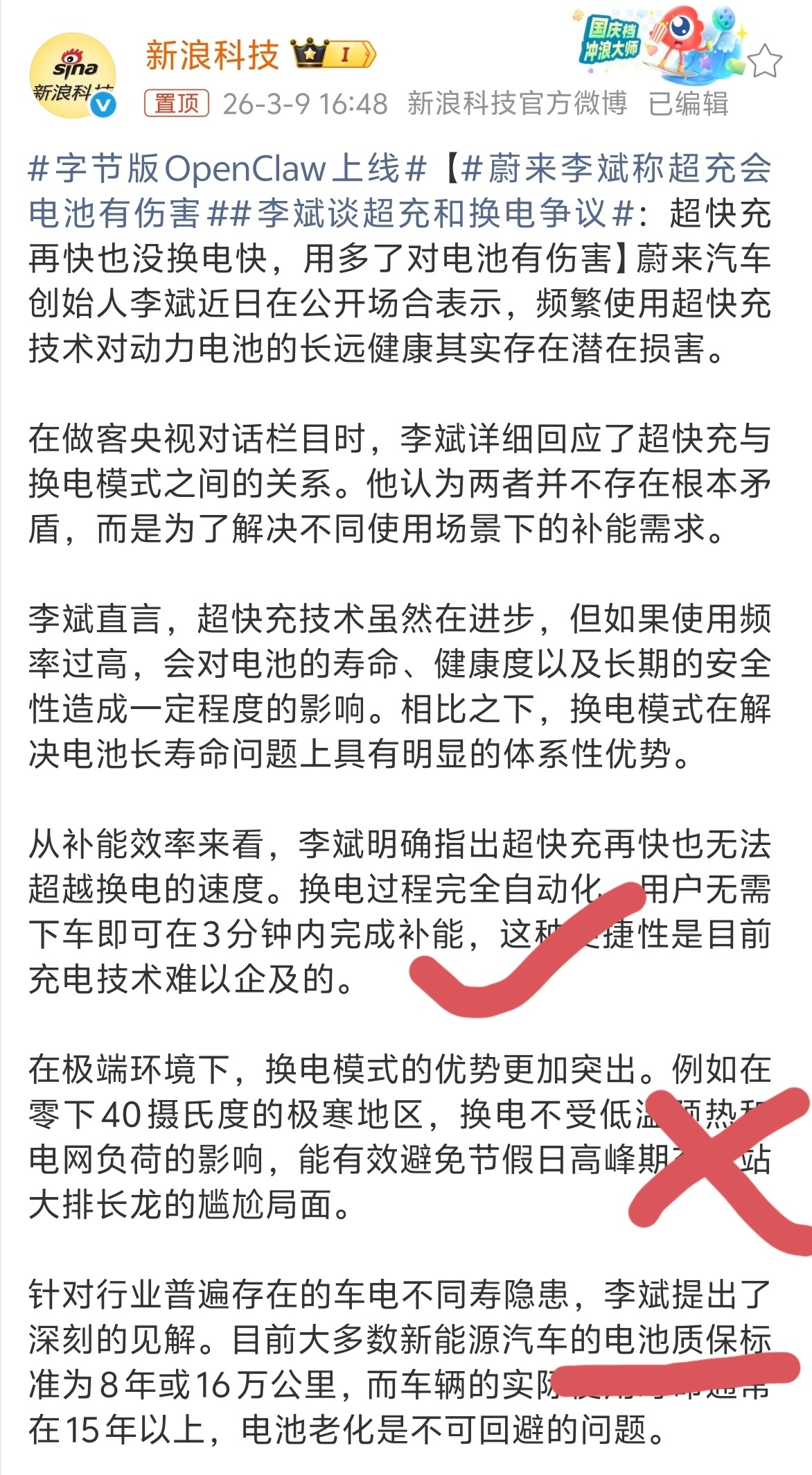 蔚来李斌称超充会电池有伤害换电我比较有发言权,说说我对李斌上述言语的看法。第一点打对号,换电不用下车,这点确实很爽,短时间内,充电速度想要超过换电速度,还有一小段距离,但是这个随着技术进步,很快就能追上。第二点打叉号,是因为第二代刀片电池闪充低温条件下我刚测试了,几乎不受影响,这个通过技术能补足低温影响。第三点画横线,目前认可,快充确实影响电池寿命,但是这个是所有厂家目前的发力重点,怎么减弱电池衰减,所以后期也能通过技术大幅改进。换电我现在最希望提升的,就是换电站电池的充电速度,大概一个小时能充满,这个速度再提升一下,有时候车多了,换电站的电池就需要等,其实也挺费时间的
