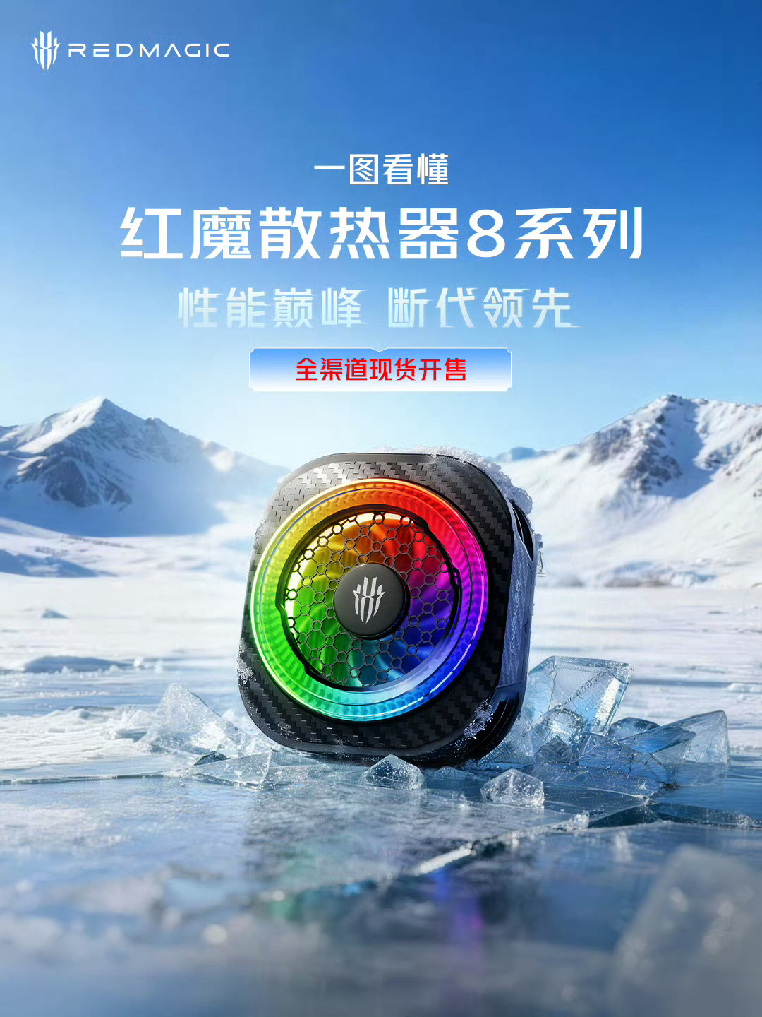 红魔散热器8Pro 正式开售了!-搭载40×40mm超大TEC半导体制冷片(124对“微型冷泵”),散热面积达1640mm²,峰值功率36W,空载最低温度可达-25℃,负载状态下能压制80℃高温设备。-采用第八代COLDLING散热架构,搭配自研11叶飓风风扇(6500转/分钟),散热效率较前代提升30%。
