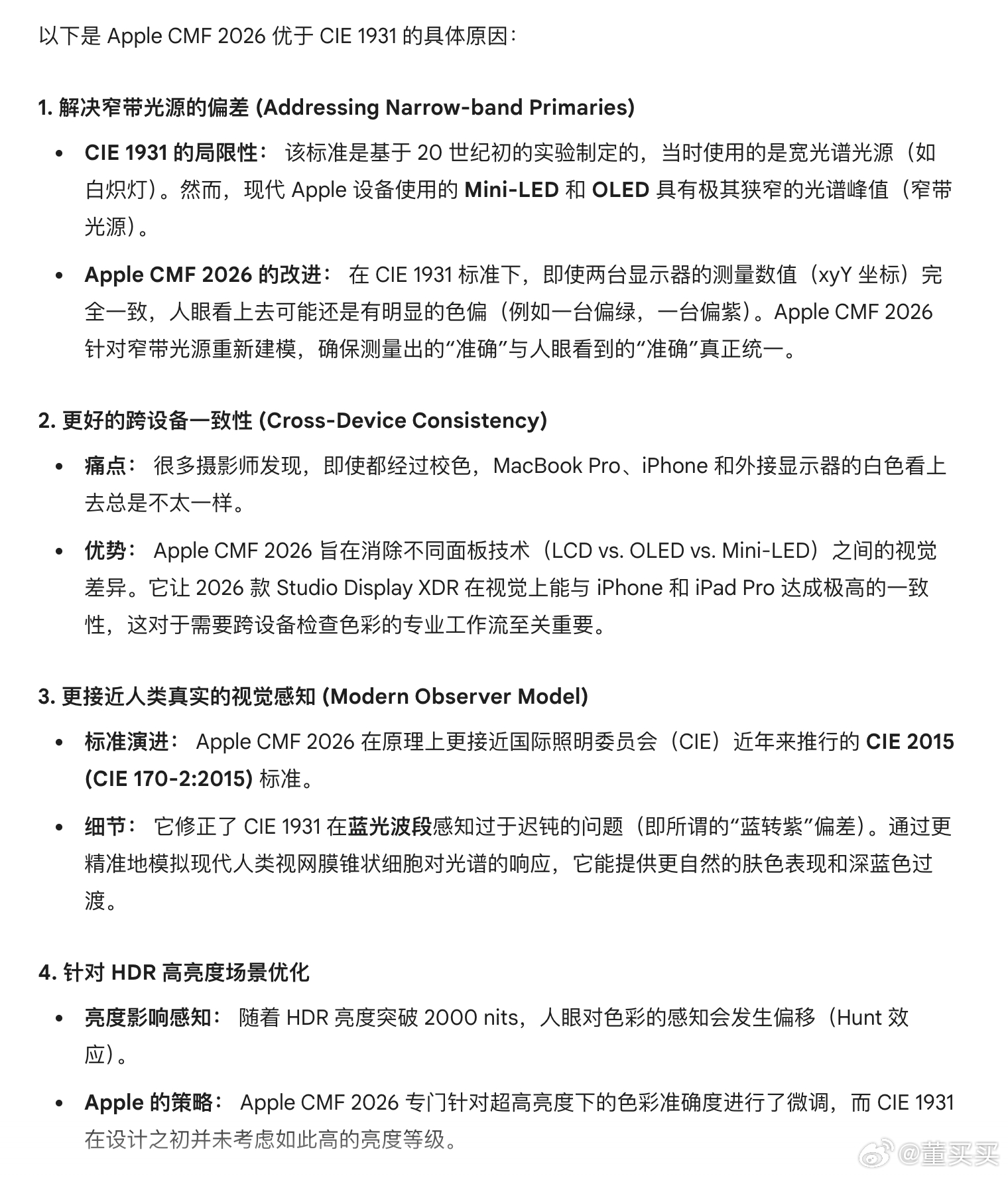 这份Studio Display XDR文档显示,苹果自己有了一套CMF自研颜色校准标准,叫做Apple CMF 2026,同时也继续支持CIE 1931流程。