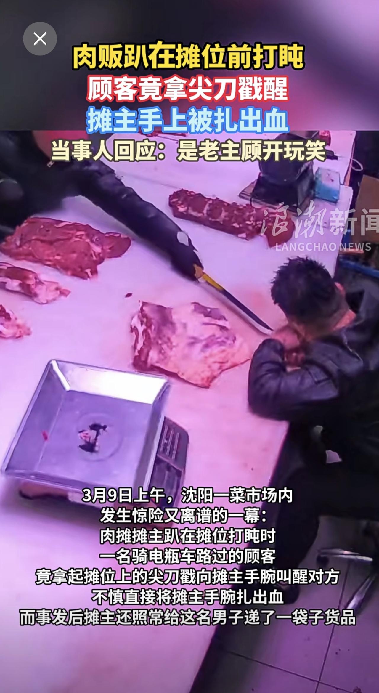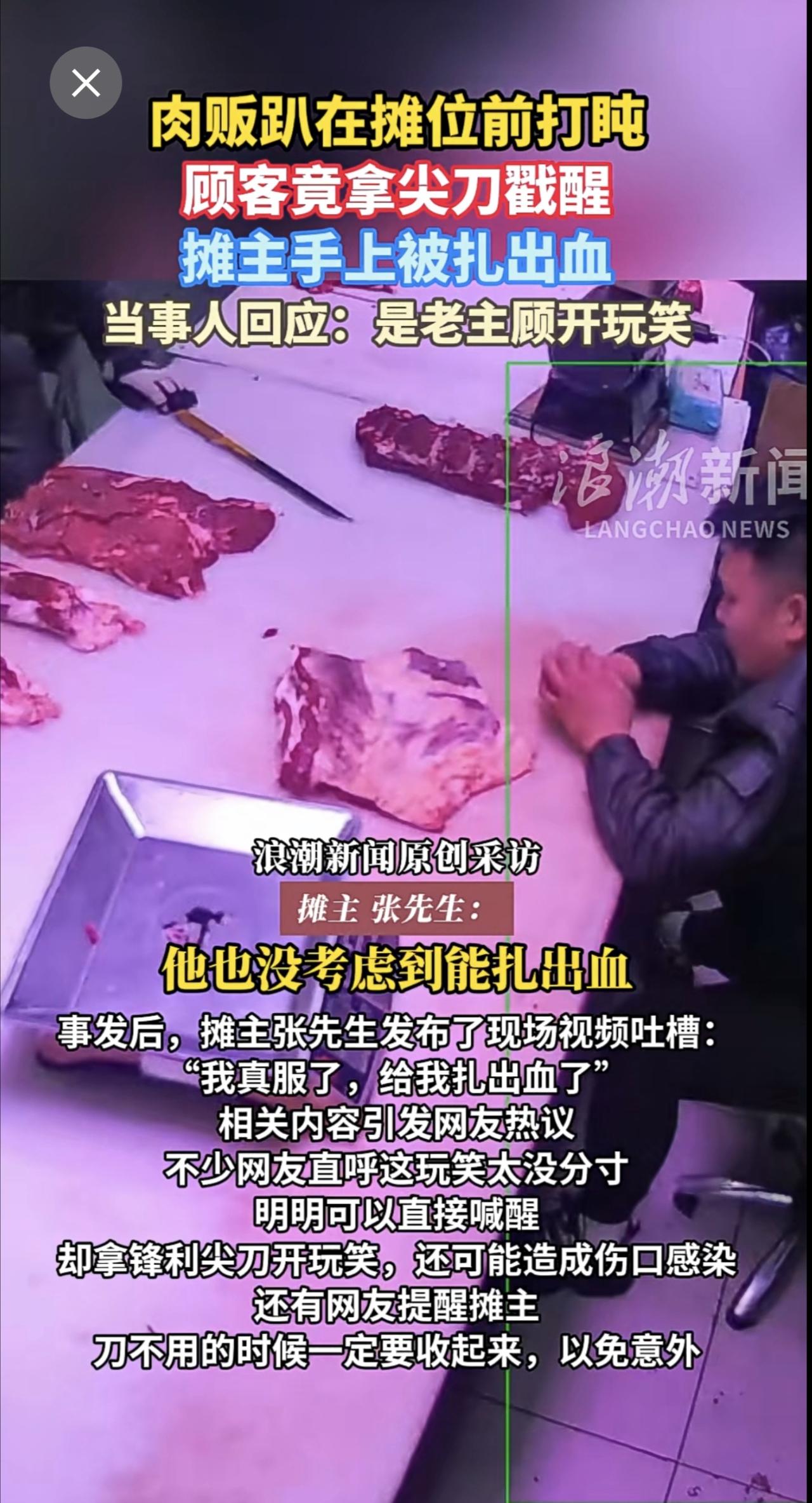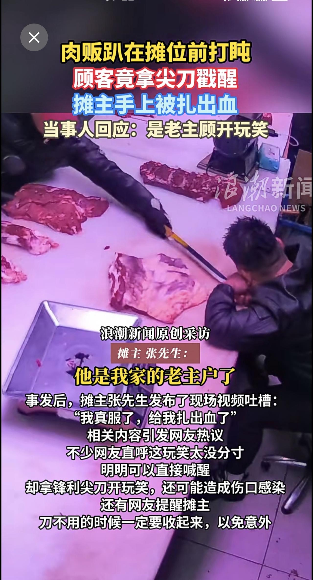 肉贩趴在摊位前打盹,顾客竟拿尖刀戳醒,摊主手上被扎出血。当事人回应:是老主顾开玩笑。