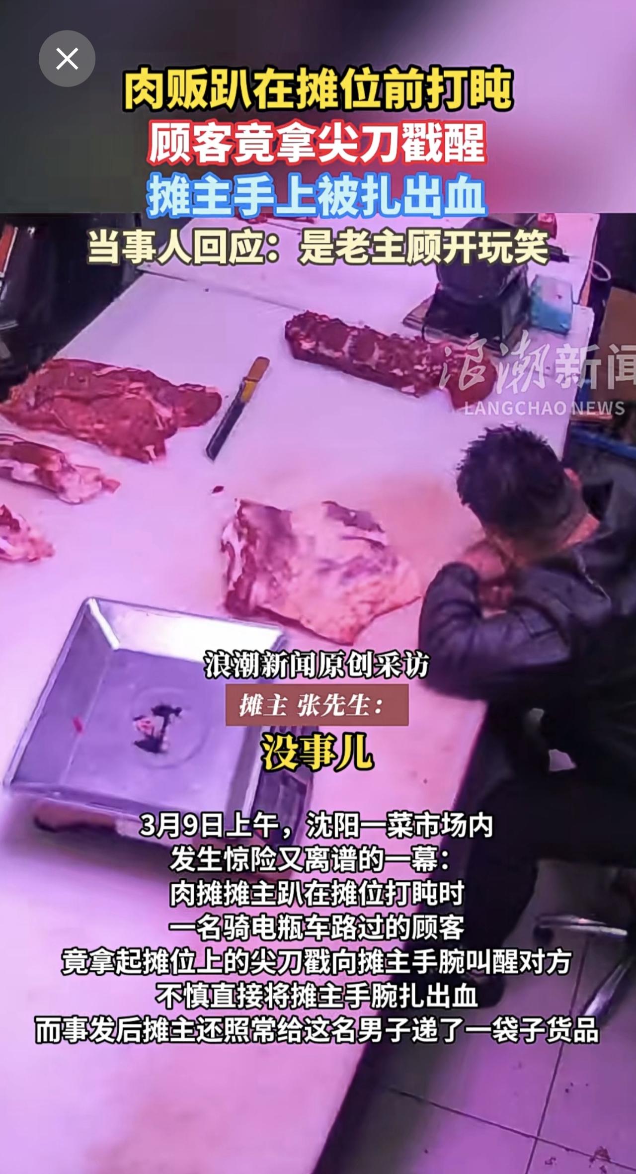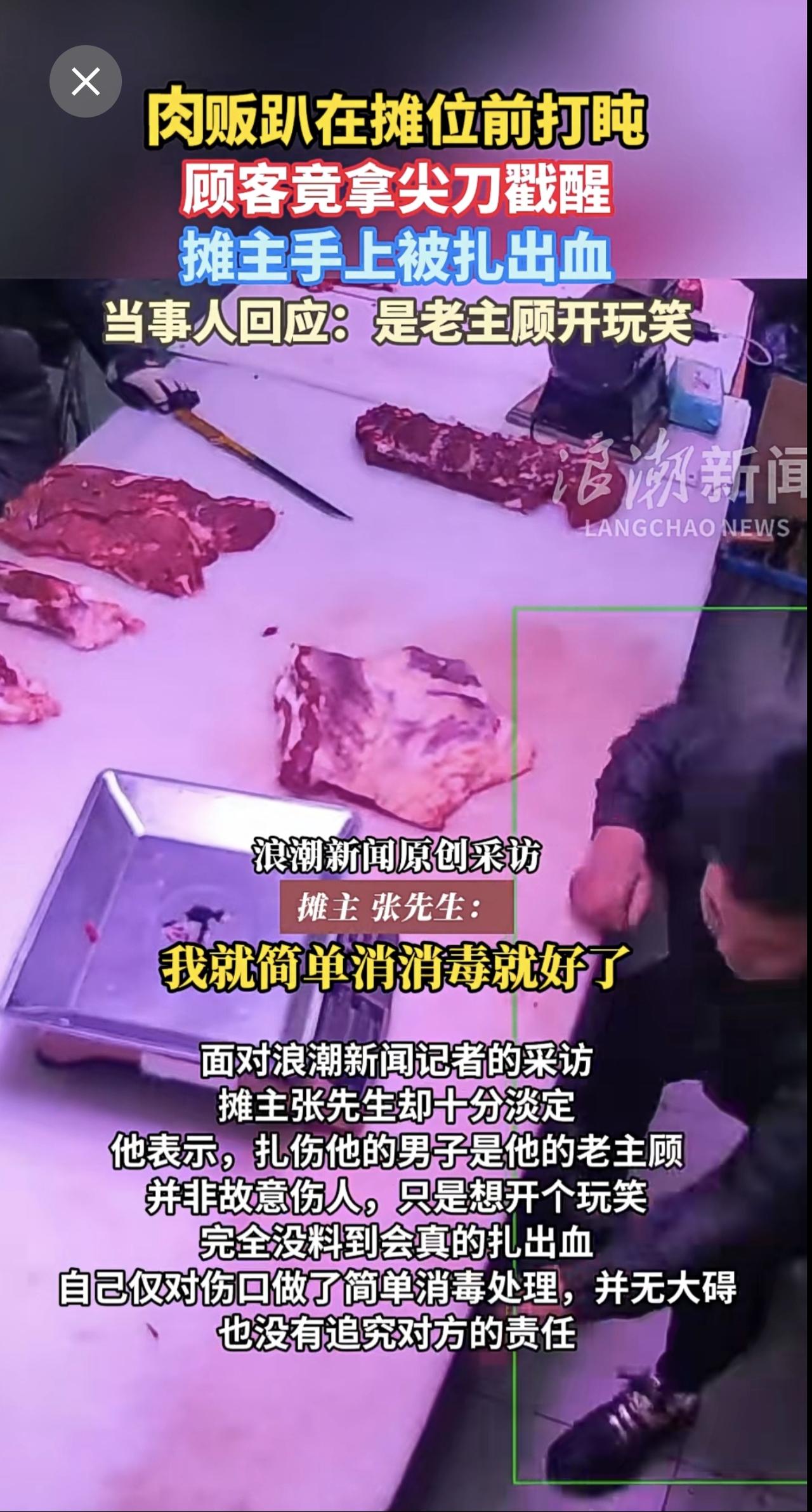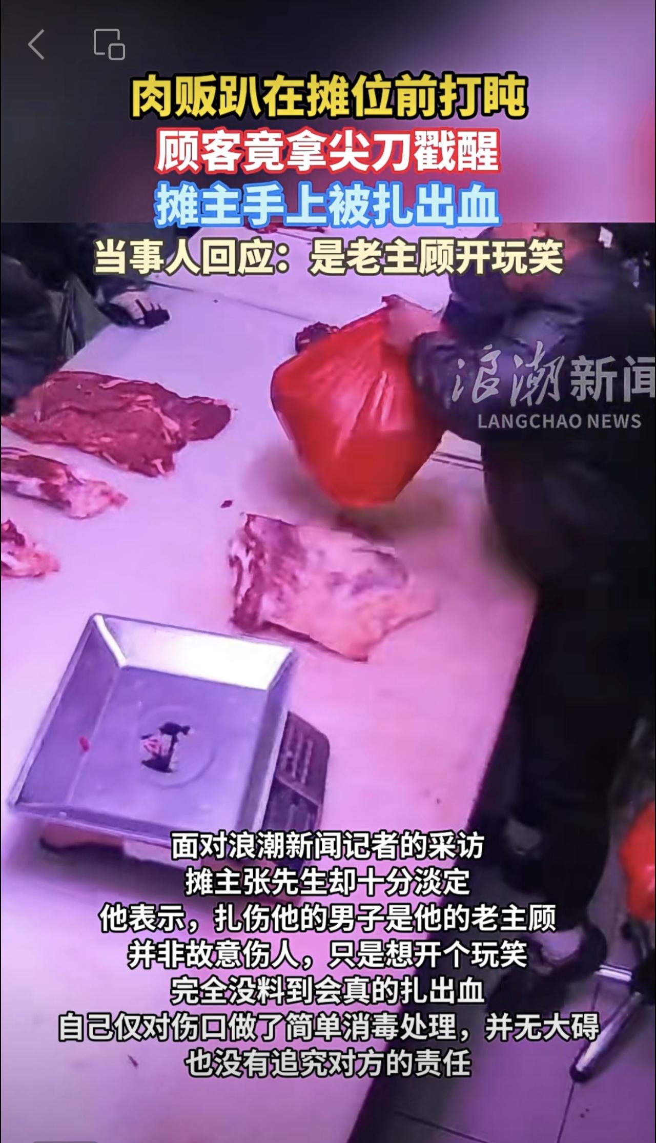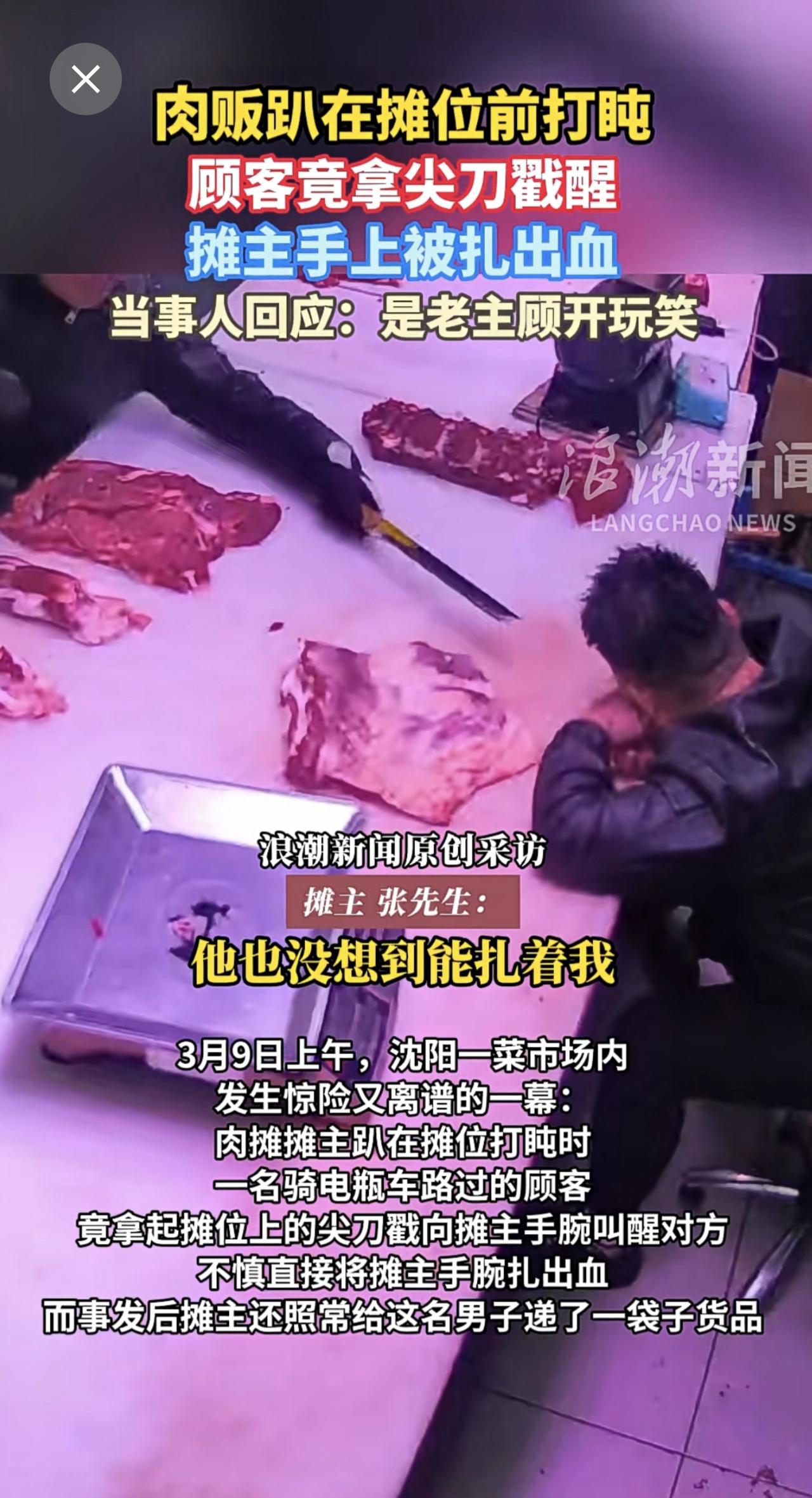 肉贩趴在摊位前打盹,顾客竟拿尖刀戳醒,摊主手上被扎出血。当事人回应:是老主顾开玩笑。