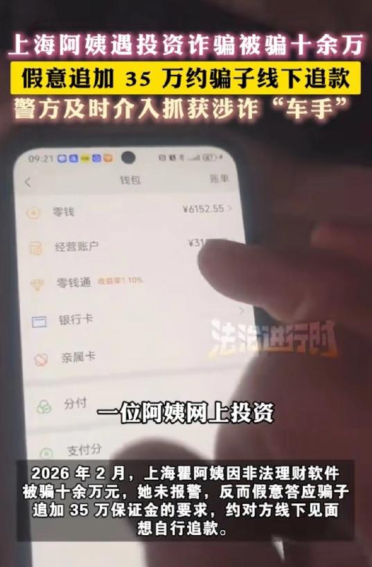 电视都不敢这么演!上海,大妈在网上投资了十几万,本想着大赚一笔,谁知却被骗了个精光,她不甘心,竟然想着约骗子线下见面,想办法把被骗的钱追回来,所以,她将计就计,假装答应骗子,说想要追加35万保证金,并和对方约好了见面地点,万万没想到,见面后的情况,跟她想象中完全不一样。   阿姨平时没事就爱刷手机,偶然刷到一款理财广告,吹得天花乱坠,说投入少、回报高,稳赚不赔,还能随时提现。   起初她也犯嘀咕,没敢多投,只试了点小钱,没想到真的能顺利拿到收益,这一下就动了心,觉得自己找到了发财的门道,于是陆陆续续把攒了多年的十几万都投了进去,满心期待着能赚一笔,改善一下生活。   可就在她盘算着提现买房补贴家用时,却发现不对劲,理财软件里的账户突然被冻结,之前承诺的收益一分都提不出来,联系客服也没人回应,这时候阿姨才后知后觉,自己是遇上电信诈骗了。   十几万那是她和老伴省吃俭用攒下的养老钱,就这么凭空消失,阿姨越想越不甘心,骨子里的犟脾气上来了,琢磨着不能就这么算了,得想办法把钱要回来。   思来想去阿姨想到了一个办法,既然骗子还在惦记着骗她的钱,不如就顺着他们的心思来,假装还没识破骗局,甚至主动提出要追加35万保证金,只为了能约骗子线下见面。   她想着只要见了面,就能找到对方的把柄,说不定就能把被骗的十几万追回来,还能把骗子交给相关部门处理,越想越觉得这主意可行,她还拉上老伴一起,打算两个人互相有个照应。   阿姨很快就联系上了骗子,装作一脸信任的样子,说自己非常看好这个投资项目,愿意再投35万,但要求必须线下见面交钱,骗子贪心不足,没多想就答应了,双方约定在沪南公路靖海路口见面。   阿姨和老伴关了自家的小店,揣着一腔孤勇赶往约定地点,一路上都在盘算着见面后的场景,却没意识到,自己的一举一动,早已被相关部门掌握。   原来在阿姨出发前,相关部门就接到了预警,怀疑她遭遇了电信网络诈骗,工作人员第一时间赶到她的店铺,却发现店里空无一人,电话也打不通,联系上她的家属后,才知道她要去和骗子线下见面。   由于担心她的人身安全,工作人员立刻制定方案,火速派遣人员赶往约定地点埋伏守候。   下午两点左右,阿姨和老伴准时抵达见面地点,可等了半天,出现的却不是她想象中的幕后骗子,只是一个年轻男子。   这个男子见阿姨两手空空,根本没带现金,瞬间察觉不对,转身就想打车逃离,就在这时,埋伏在周围的工作人员及时出现,当场将该男子抓获。   后来大家才知道,这个被抓的男子只是受骗子指使,专门负责转移涉诈资金的跑腿人员,根本不是真正的幕后主谋,那些藏在背后的骗子,大多躲在境外,从不轻易露面。   工作人员当场给阿姨普及了反诈知识,告诉她私自约见骗子不仅要不回钱,还可能有生命危险,被骗后第一时间求助才是最安全有效的方式。   目前被抓的男子已被依法处理,案件还在进一步侦办中,阿姨虽然没立刻追回被骗的钱,却也算是帮着揪出了诈骗链条上的一环,只是这场看似勇敢的“反杀”,想想都让人后怕。