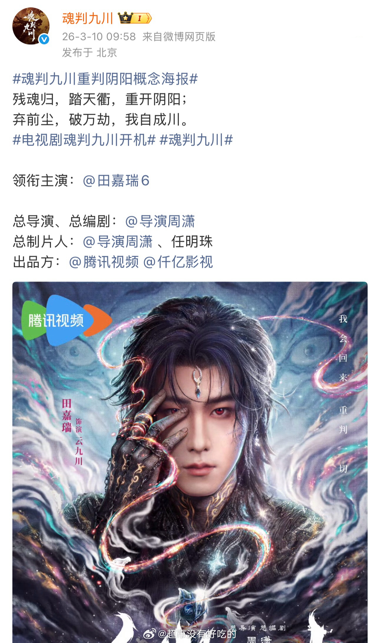 田嘉瑞《魂判九川》官宣开机物料大男主单人官宣祝瑞瑞新剧开机大吉,云九川拍摄顺利田