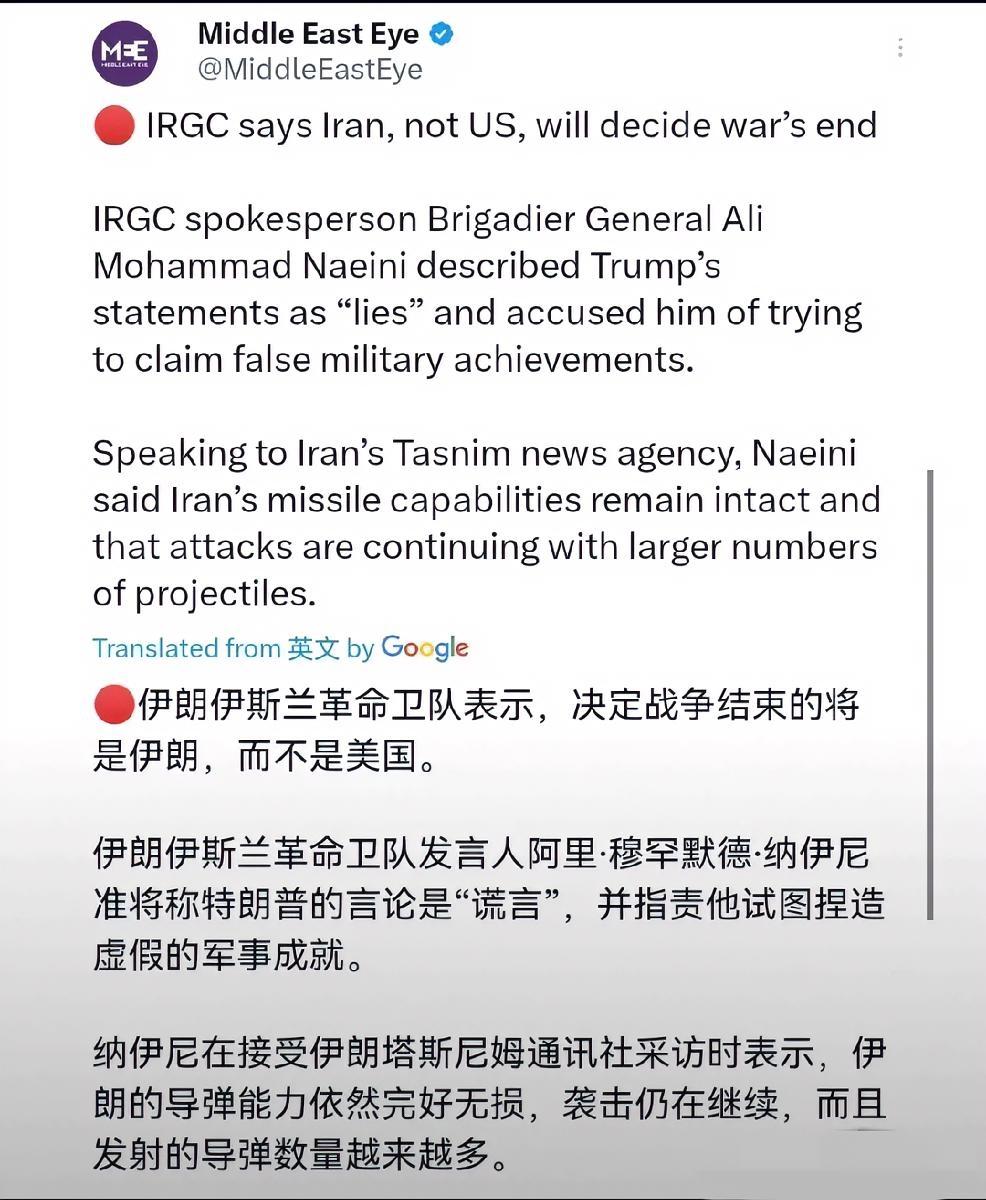 3月10日,伊朗伊斯兰革命卫队发文:“决定战争结束的将是伊朗,而不是美国。 伊朗伊斯兰革命卫队发言人阿里•穆罕默德•纳伊尼准将称:特朗普的言论是谎言,并指控他试图捏造虚假的军事成就。 纳伊尼在接受伊朗塔斯尼姆通讯社采访时表示:伊朗的导弹能力依然完好无缺,偷袭应在继续,而且发射的导弹数量越来越多。” 个人认为:这是伊朗的选择,针锋相对,寸步不让,绝不妥协。 现在的客观事实是美国和以色列仅仅依靠空袭,已经不可能完成目标。伊朗封锁霍尔木兹海峡,导致全球能源危机,这是至关重要的战略手段,而且该手段伊朗运用得十分灵活巧妙,仅仅封锁美国,以色列以及支持美以的国家的船只。直接导致美国作战能力崩溃的原因是美国在中东的基地遭遇了毁灭性的打击,这是重要的因素,不可回避而且造成的影响暂时无法弥补。 美国妄想认怂,可是伊朗,以色列不答应,这场战争将会直接改写三个国家的命运。改变美国,首先要改变犹太人,因为美国的上层建筑大多数都是犹太人。