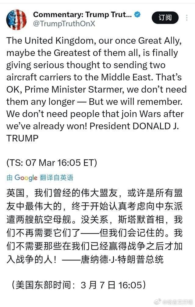 凤凰新闻特朗普今天(北京时间3月8日)发文奚落斯塔默:“英国,我们曾经的伟大盟友,或许是所有盟友中最伟大的,终于开始认真考虑向中...特朗普今天(北京时间3月8日)发文奚落斯塔默:“英国,我们曾经的伟大盟友,或许是所有盟友中最伟大的,终于开始认真考虑向中来自