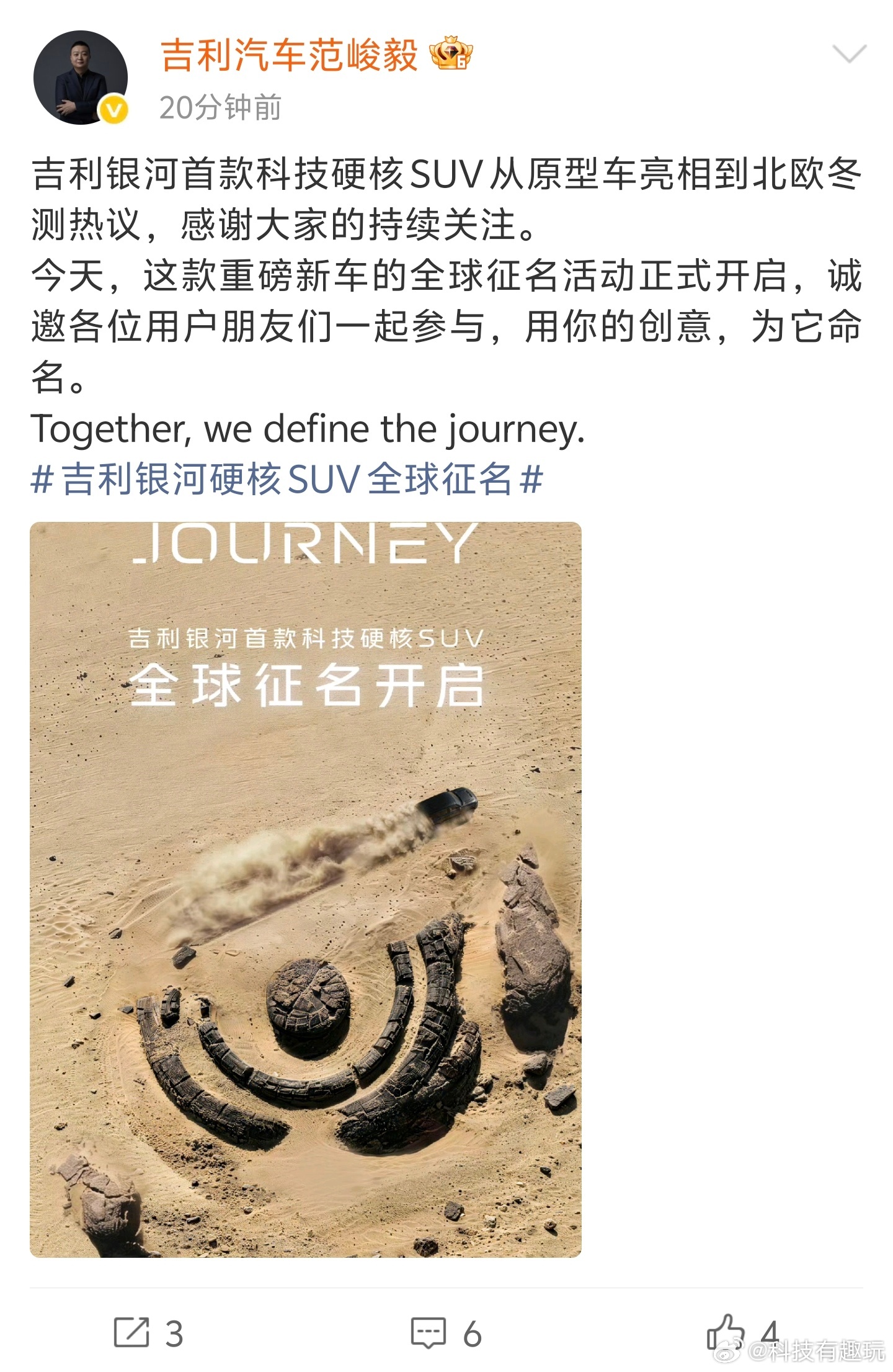 吉利银河硬核SUV全球征名吉利银河首款科技硬核SUV正式开启全球征名开始了,我先来几个:银河 星盾、银河 拓界者、银河 穹宇、银河 骁途、银河 锐征!大家觉得哪个名字好