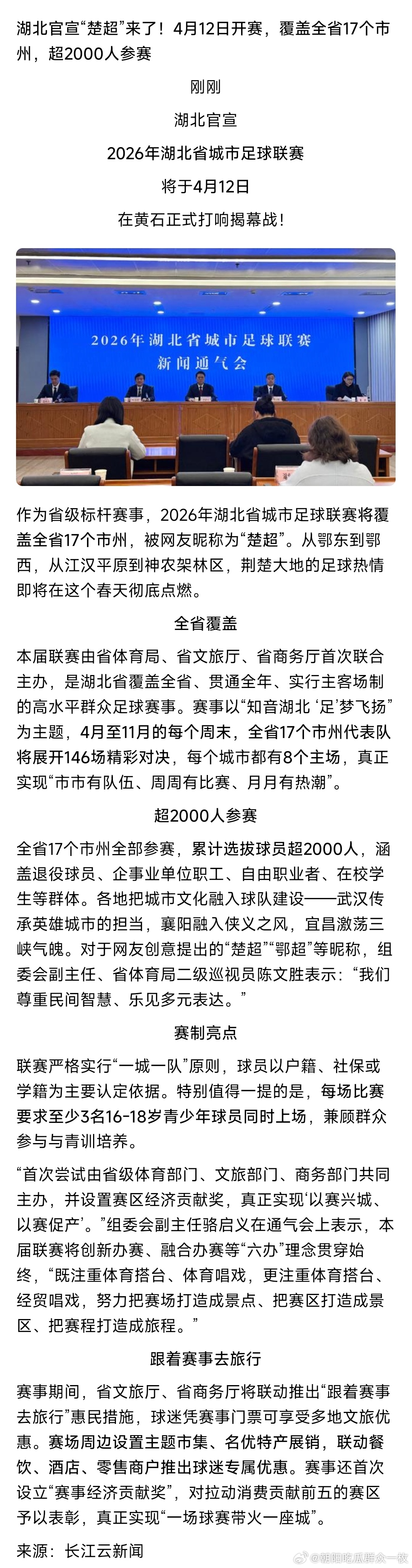 湖北宣布:“楚超”将于4月12日开赛,覆盖全省17个市州,超2000人参赛!