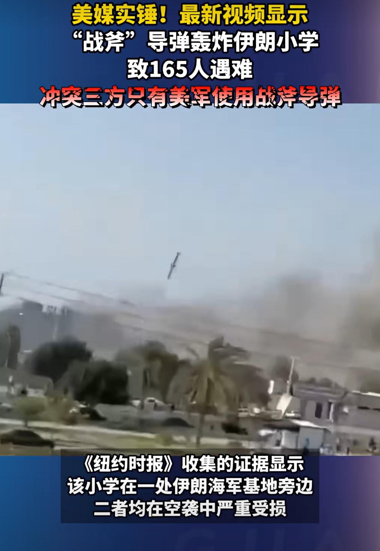 《纽约时报》披露的视频显示,当地时间2月28日,一枚战斧巡航导弹击中了伊朗南部米纳卜市的一所小学。从慢镜头中,可以清晰看到战斧巡航导弹的掠影,而只有美军在使用这种导弹。《纽约时报》根据卫星图像、社交媒体和其他经核实的视频,证实了这段视频的真实性,此前特朗普一直嘴硬说是伊朗自己炸的,现在还有什么话说?