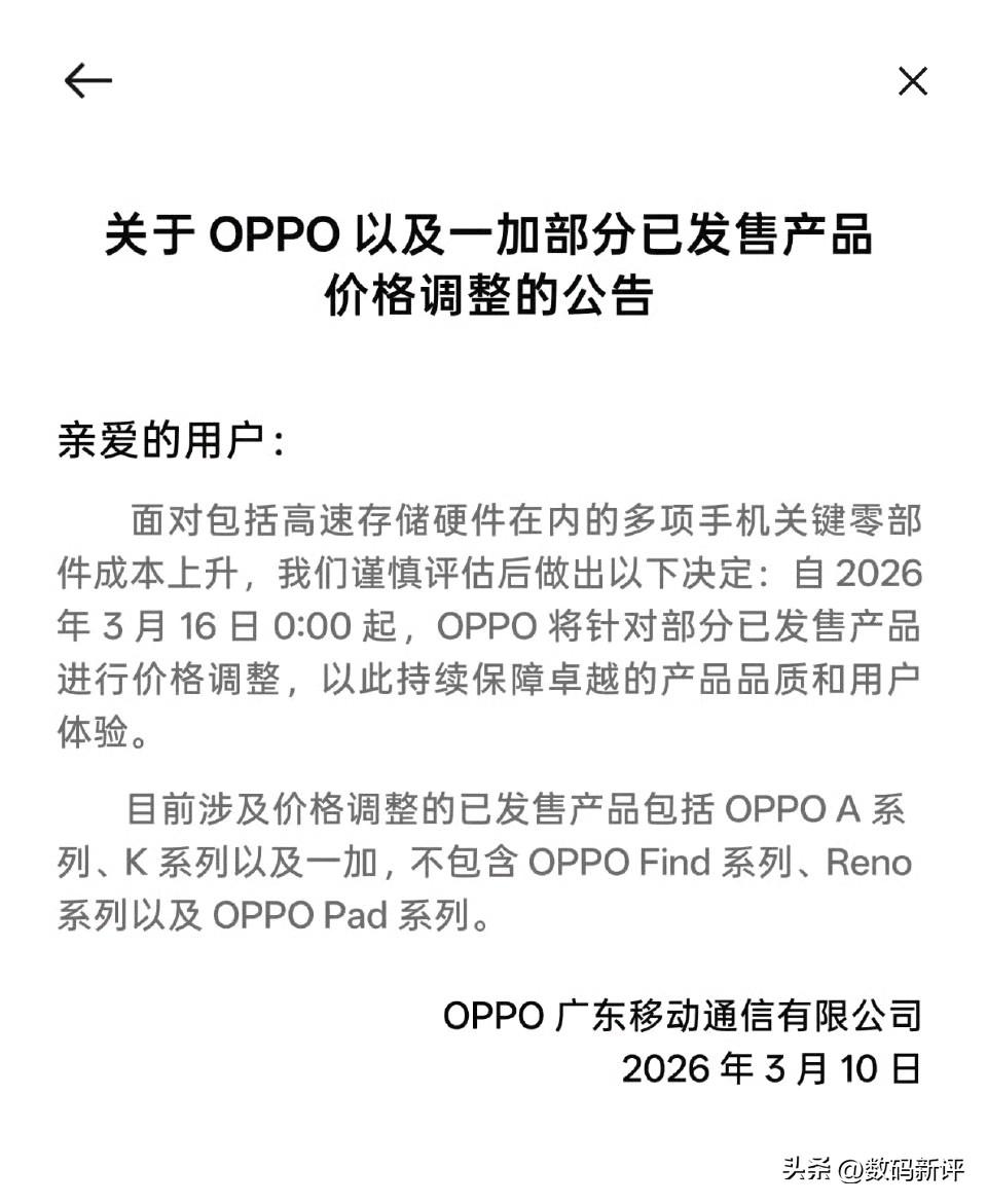 OPPO发布公告宣布涨价了[捂脸]都是对已经开售的机型进行涨价,基本上都是中低端机型,已经开售的旗舰机还没有决定涨价[灵光一闪]大概率迭代旗舰机肯定是涨价的,主要影响中低端机型,因为利润低,旗舰机利润更高还能维持住不涨价或者少涨价一点,后续其他几家可能也有公告,或者悄悄涨价
