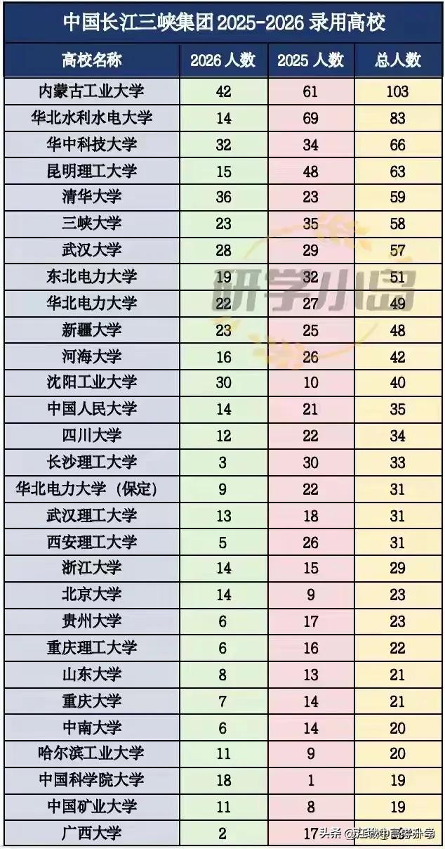 中国长江三峡集团2025-2026年录用高校毕业生情况曝光! 1. 总体录用规模与趋势 录用人数呈现出明显的“金字塔”结构: 头部高校:录用人数较多,集中在水利、电力、理工科强校。 中坚力量:录用人数适中,多为各地区的重点综合性大学或行业特色高校。 尾部高校:录用人数较少,多为普通高校或特定专业对口的院校。 2. 2026年录用人数显著变化的高校 通过对比2025年和2026年的数据,高校的录用人数发生了显著变化: 大幅增长的高校: 内蒙古工业大学:从61人激增至103人,增长了42人,成为录用人数最多的高校。这可能表明三峡集团与该校在某些特定专业(如电力、机械等)上有深入的合作或人才输送协议。 沈阳工业大学:从10人增至30人,增长了20人。 清华大学:从23人增至36人,增长了13人。作为顶尖学府,清华大学的录用人数增长也反映了三峡集团对高层次人才的重视。 三峡大学:从35人增至58人,增长了23人。作为三峡集团的“亲儿子”高校,其录用人数的稳定增长也在情理之中。 大幅下降的高校: 华北水利水电大学:从69人降至14人,下降了55人,降幅最大。这可能与该校当年的毕业生人数、专业匹配度或三峡集团的招聘策略调整有关。 昆明理工大学:从48人降至15人,下降了33人。 长沙理工大学:从30人降至3人,下降了27人。降幅达到90%,这可能与该校当年的毕业生人数、专业匹配度或三峡集团的招聘策略调整有关。 3. 三峡集团的“亲儿子”高校 三峡大学无疑是三峡集团的“亲儿子”高校,其录用人数在2025年和2026年都位居前列,分别为35人和58人。这表明三峡集团与三峡大学在人才培养、科研合作等方面有着深厚的合作关系。 4. 行业特色鲜明的高校 三峡集团作为一家以水利、电力为核心的大型央企,其录用高校也呈现出明显的行业特色: 水利电力类高校:如华北水利水电大学、东北电力大学、华北电力大学、武汉大学(水利水电学院实力强劲)、河海大学等,都是三峡集团录用的主要高校。 理工科强校:如清华大学、华中科技大学、哈尔滨工业大学、上海交通大学、西安交通大学等,这些高校的理工科实力强劲,为三峡集团输送了大量高素质人才。 5. 地域分布 录用高校的地域分布较为广泛,但主要集中在以下几个区域: 华中地区:武汉大学、华中科技大学、武汉理工大学、三峡大学等,这些高校位于三峡集团总部所在地湖北省,具有明显的地域优势。 华北地区:清华大学、北京大学、华北电力大学、中国矿业大学(北京)等,这些高校位于首都北京,人才资源丰富。 华东地区:上海交通大学、浙江大学、东南大学、河海大学等,这些高校位于经济发达的长三角地区,科研实力雄厚。 东北地区:哈尔滨工业大学、东北电力大学、东北大学等,这些高校在电力、机械等传统工科领域有着深厚的积淀。