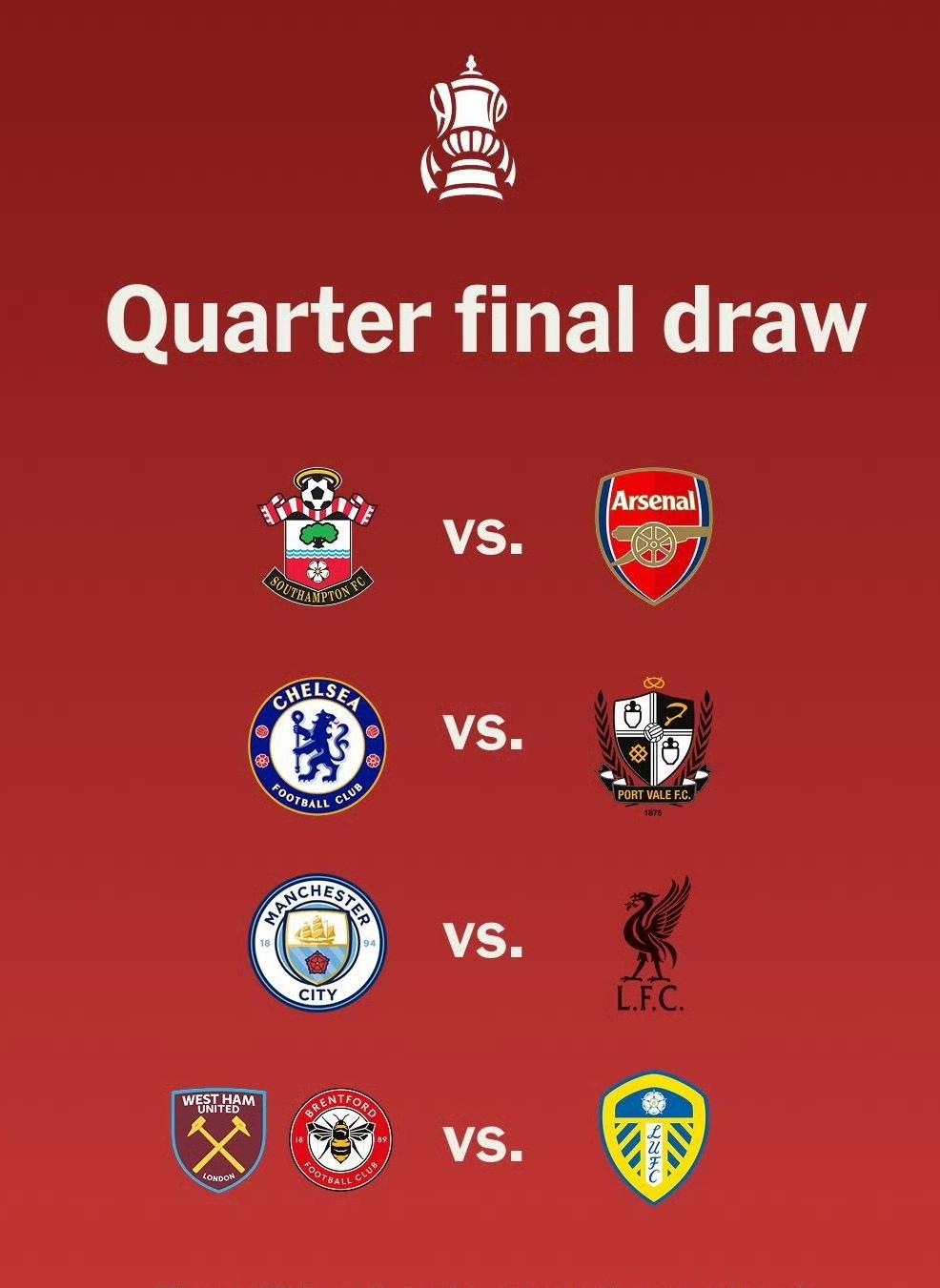 足总杯八强抽签,阿森纳抽到了英冠的南安普顿。同时,曼城抽到了利物浦,这意味着,阿森纳在冲四冠王的道路上少一个劲敌。 这个赛季,阿森纳实力强,杯赛抽签运气还好,阿尔特塔,出人头地的机会来了。