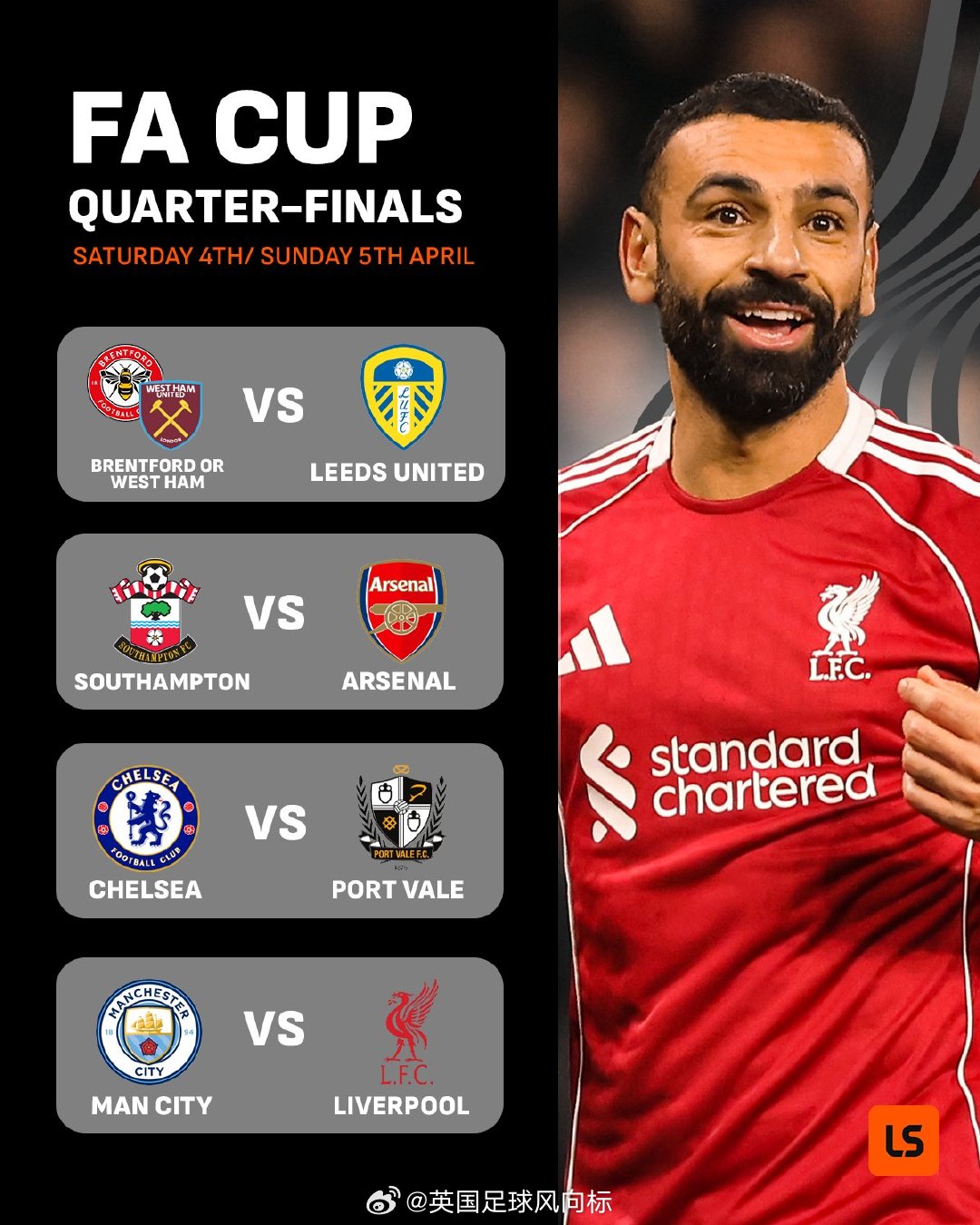 【曼城大战利物浦!足总杯8强战对阵出炉】英格兰足总杯8强战抽签结果出炉,阿森纳和切尔西都抽到好签,曼城则要火拼利物浦(名前为主场):