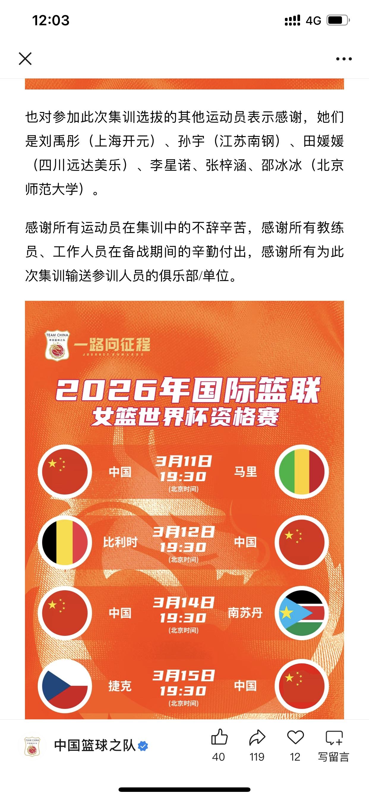 中国女篮教练组的取舍如我所言 我想关注中国女篮的观众应该都从各路小道消息看到了中国女篮在世预赛的十二人大名单 中国女子篮球国家队官方账号今天才发布,所以这个消息是正确的,没有存在错误 其中备受瞩目的刘禹彤还是被淘汰出局 而我早就发文说过,包括昨天还说过这话,我说刘禹彤大概率无缘最终的十二人大名单 我这篇微头条,主要是想表达我关注中国女篮是认真的,而且我从不说什么代表全国球迷之类的话,我一直都是说“我认为”或“个人看法”等诸如此类的说明 刘禹彤这一次的缺席,估计以后再想进入中国女篮正式大名单,只会越来越难!