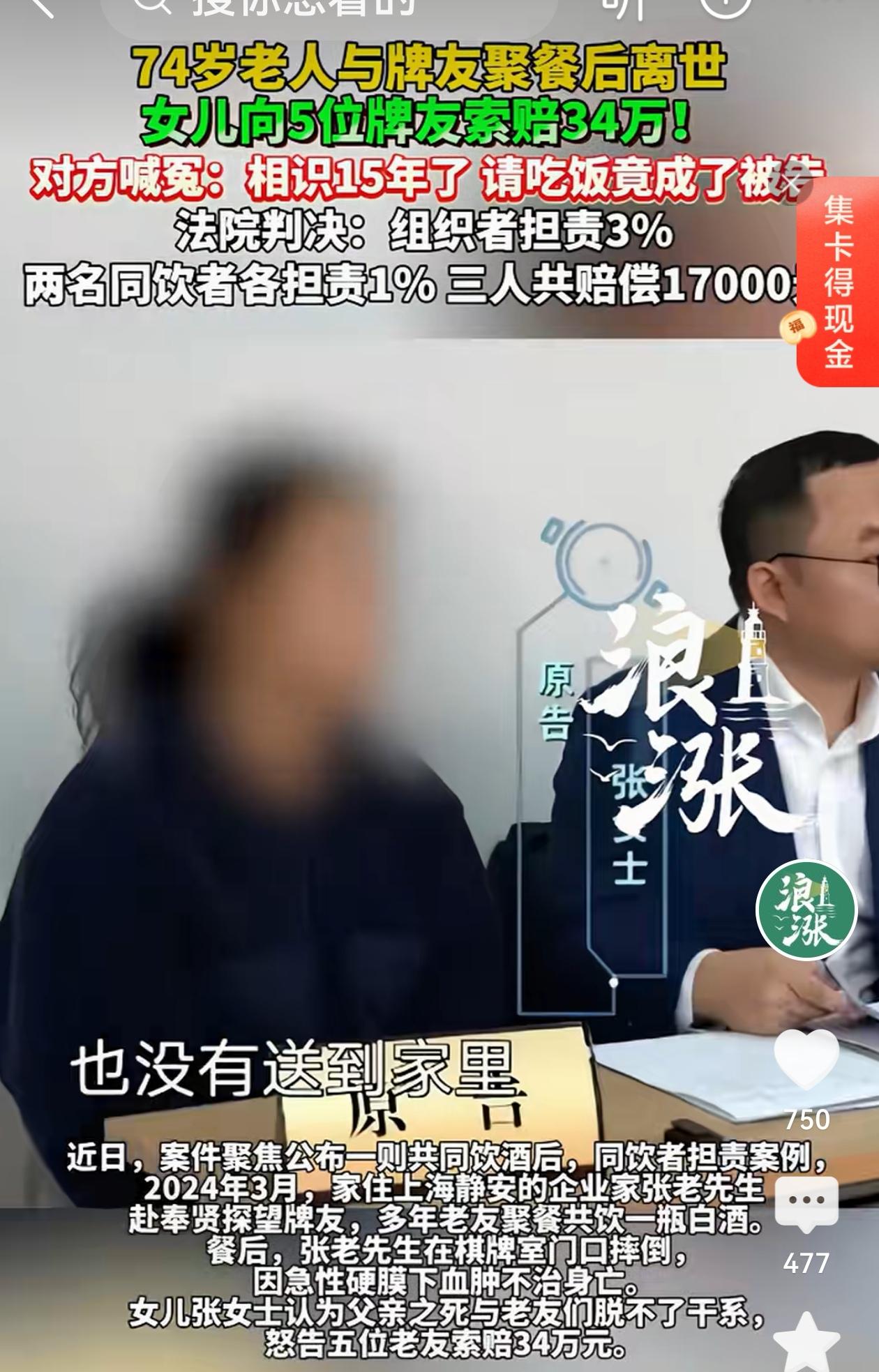 上海静安,一七旬老人去探望老友,共饮一瓶白酒。聚餐后,老人在棋牌室门口摔倒身亡,女儿把5个老友告上法庭,索赔34万,5个老友大呼冤枉,最后法院这样判了! 事情发生在2024年3月,张某某七十多岁,平时身体不错,这次专程从市区赶到奉贤,与相识十五年的牌友见面。 几位老朋友早已备好饭菜,在家里摆了一桌,聊天叙旧,边吃边喝,一瓶白酒分着喝完。 饭后,张某某兴致未减,提出再去棋牌室坐坐,有人劝他休息,他仍然坚持同行。 几个人便骑着电瓶车,把他送到常去的那家棋牌室门口。 刚走到门前,他脚步踉跄,人突然向前栽倒,当场失去意识。 在场的人慌了神,拨打了急救电话,又联系医院,救护车赶到后一路送医。 诊断结果是急性硬膜下血肿,虽经抢救,最终没有挽回。 几位老友随后到家中吊唁,本以为是一次意外,没想到风波才刚开始。 张某某的女儿提出三点质疑,老人醉酒未被送回家,摔倒后未被妥善看护,送医时间过长。 她向五名参与聚餐的人提起诉讼,索赔34万元。 五名被告各有说法,有人表示当天只喝了三两,大家并未劝酒。 有人拿出急诊记录,说明从事发地到医院路程本就需要时间,并无拖延。 还有人强调自己饭没吃完就离开,事发时并不在场。 案件进入审理阶段,法院对现场进行了勘查,也调取了监控资料。 一个细节引起注意,组织聚会的赵某并不清楚张某某的家庭住址。 所谓送回家,在客观条件上难以实现。 法律上判断侵权,需要看是否存在过错,以及过错与损害之间是否有因果联系。 张某某是完全民事行为能力人,自主饮酒,自行决定前往棋牌室,对自身安全负有主要注意义务。 不过,作为同饮者,尤其是组织者和陪同前往棋牌室的人,在发现他饮酒后行动不稳的情况下,应承担一定的照顾责任。 法院认定赵某承担3%的责任,两名陪同者各承担1%的责任,三人合计赔偿17000元。 提前离场以及未参与后续活动的两人,不承担赔偿。 判决结果出来后,双方都觉得难以接受。 家属认为赔偿比例过低,几位老友则觉得好心招待却背上责任。 类似的争议并非个例。 温州曾有老人打麻将时情绪激动倒地,家属向棋牌室老板和九名牌友索赔。 经调解,老板出于人道补偿2.5万元,其余牌友各承担部分金额,当地部门还协调救助金。 北京、广西、武汉也出现过共同饮酒后发生意外的判例,有的因将醉酒者单独留在停车场,有的送到小区门口未交给家人,法院均根据过错比例判定赔偿。 这些案例的共通点在于,同饮并不必然担责,关键在于是否尽到合理的提醒与护送义务。 把人送到门口,并不等同于安全到家。 聚会本是为了热闹,年纪大了更看重陪伴。 酒桌上气氛一热,容易忽视身体信号。 对老年人而言,轻微摔倒也可能带来严重后果。 家属的悲痛可以理解,朋友的委屈也并非没有理由。 法院给出的比例并不高,却划出了一个边界。 一起十五年的情谊,因为一次疏忽走到对簿公堂,留下的不只是赔偿数字,还有对责任的重新认识。 聚餐喝酒仍会继续,朋友往来也不会停止。 在举杯之前,多一分照看,多一分清醒,或许能少一场遗憾。