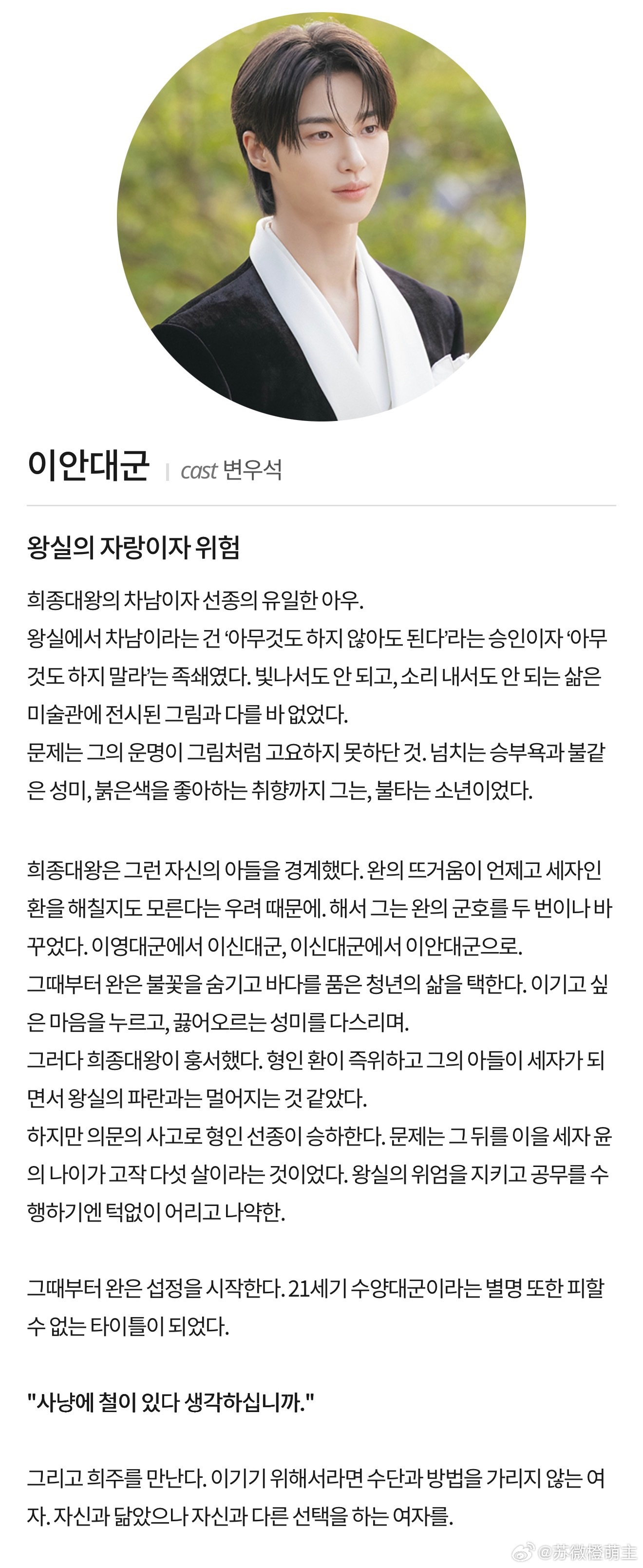 21世纪大君夫人 21世纪大君夫人人物介绍李安大君王室的骄傲与危险他是熙宗大王的次子,也是宣宗的唯一弟弟。在王室,次子这个身份意味着“什么都不用做也可以”的许可,同时也是“什么都不要做”的枷锁。不能发光,也不能发声的人生,与美术馆里展出的画作并无不同。问题在于,他的命运并不像画作那样高雅宁静。满溢的胜负欲、火暴的脾气、乃至喜欢红色的品味——他,本是一个如烈焰般的少年。熙宗大王对这样的儿子心存戒备。出于担心“完”的炽热终有一天会吞噬世子的光芒,他两次更改了“完”的君号。从“李英大君”到“李信大君”,再从“李信大君”到“李安大君”。从那时起,“完”选择隐藏火焰,过上了如大海般深邃的青年生活。压抑着想赢的心,克制着沸腾的脾气。后来熙宗大王薨逝。兄长即位,他的儿子成为世子,王室的风波似乎逐渐平息。然而兄长宣宗因意外事故突然驾崩。问题是,继承王位的世子“允”年仅五岁。要维护王室的威严和处理国事,他实在过于年幼和脆弱。从那时起,“完”开始了摄政。他不可避免地获得了“21世纪的首阳大君”这一别称。“你知道狩猎是有季节的吗” 然后,他遇到了熙珠。一个为了胜利可以不择手段的女人,一个与自己相似,却做出不同选择的女人。
