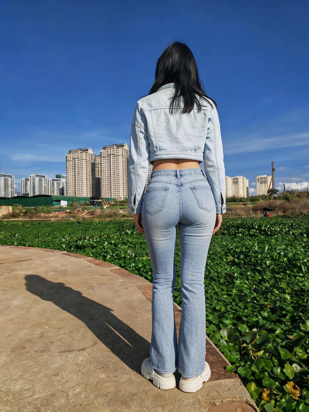 在湖边,背对镜头,天空晴朗。