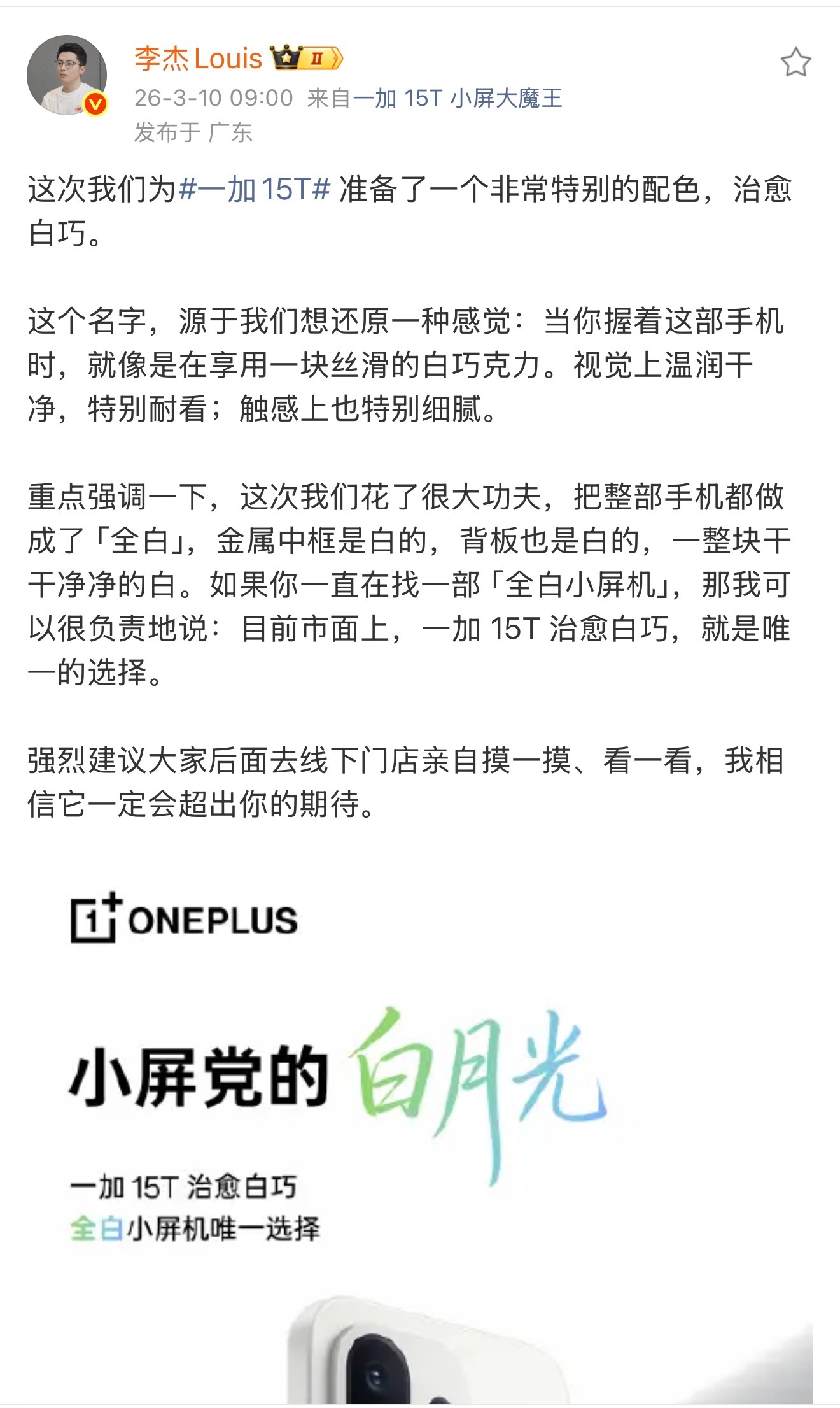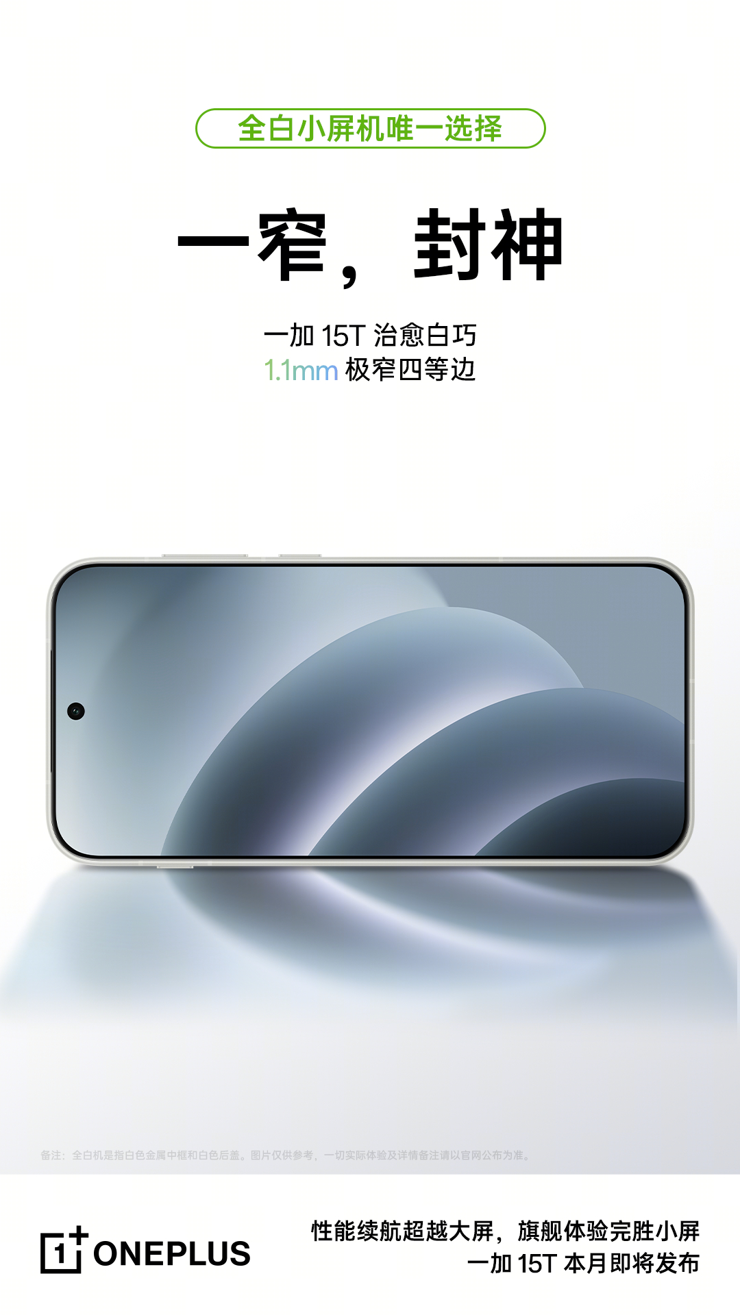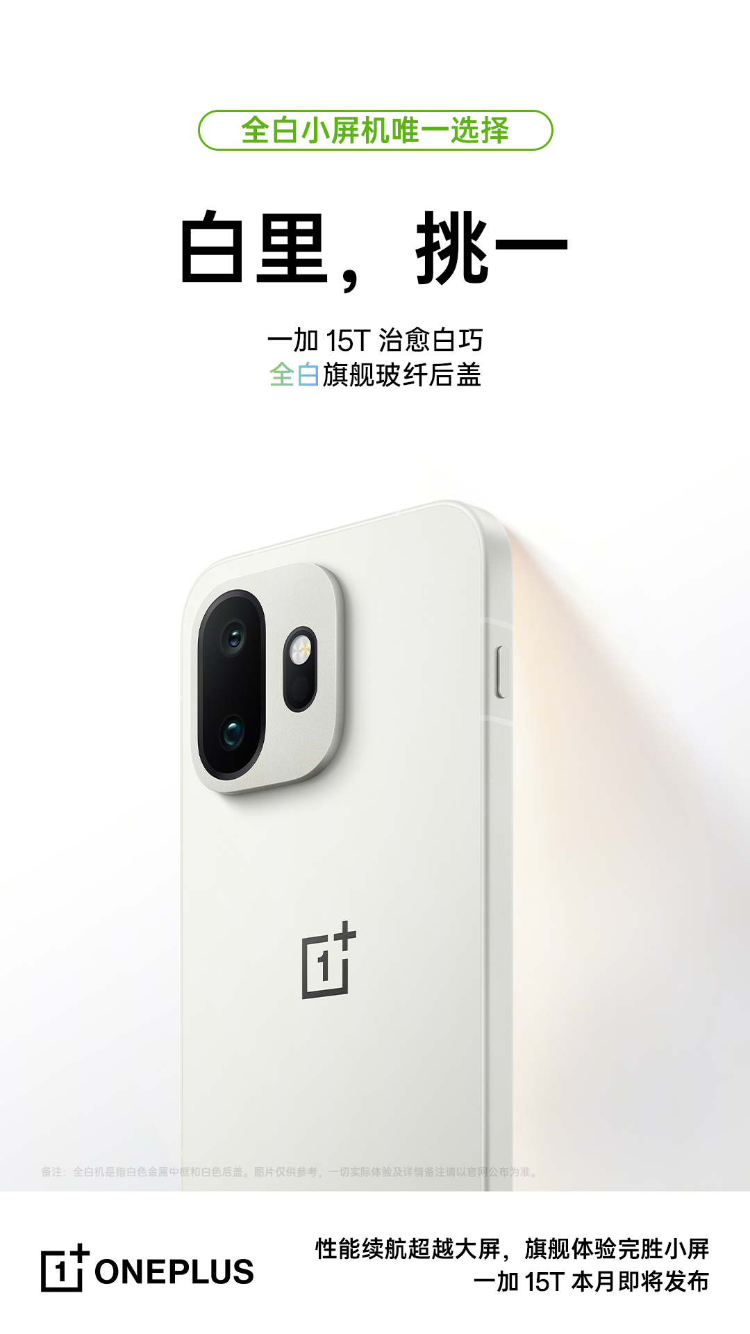 一加15T的白巧配色来了,整部手机都做成了「全白」,金属中框是白的,背板也是白的,真的白月光来了!1.1mm的极窄四等边,无论是正面还是背部,一加15T 的颜值和质感都非常在线。做纯白真的很考验工艺,一加这次也是花了很大功夫,白月光真的是小屏党的DreamPhone了。