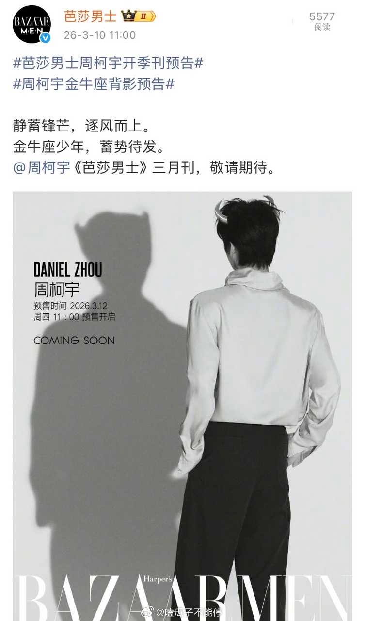 周柯宇《芭莎男士》开季刊预告来了,开季刊的第一位00后男演员